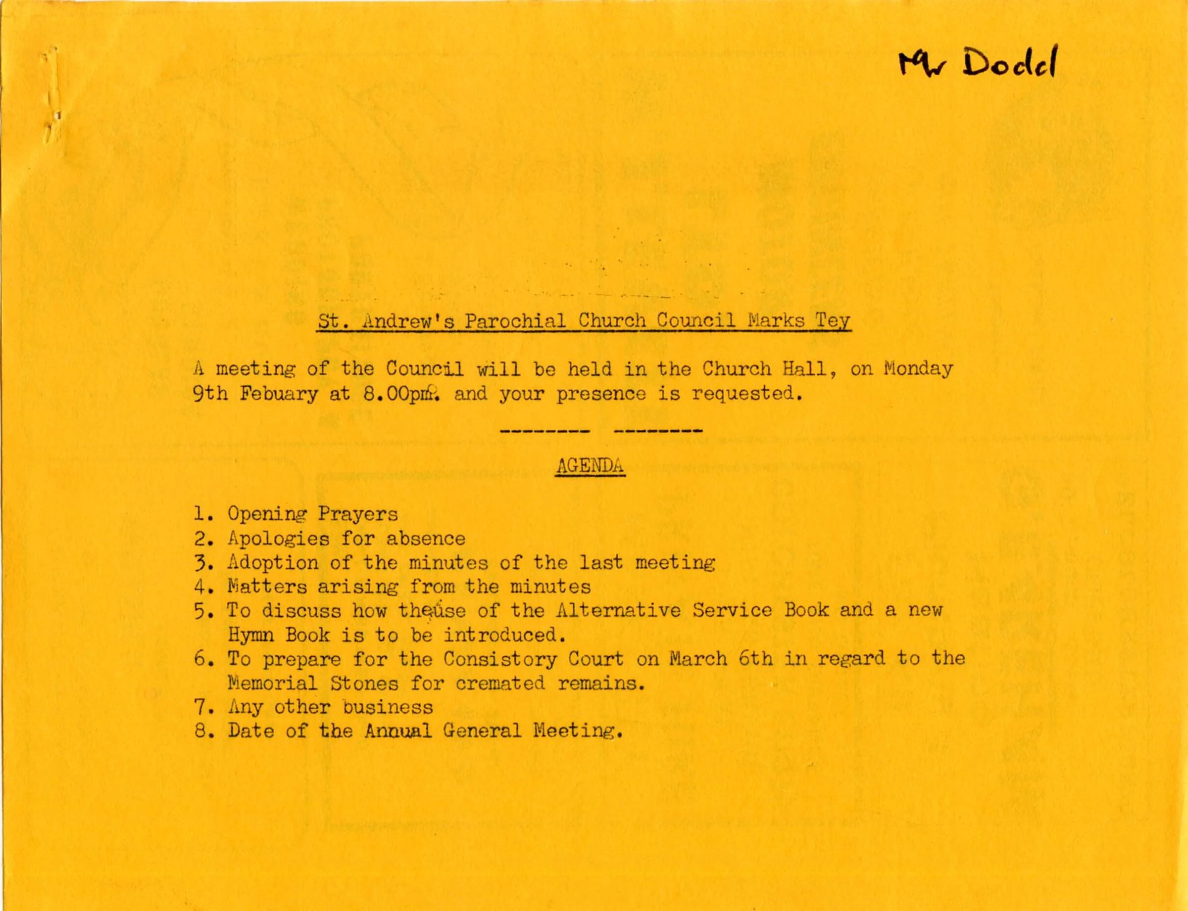 Agenda for the Parochial Church Council meeting, 9th February 1980.