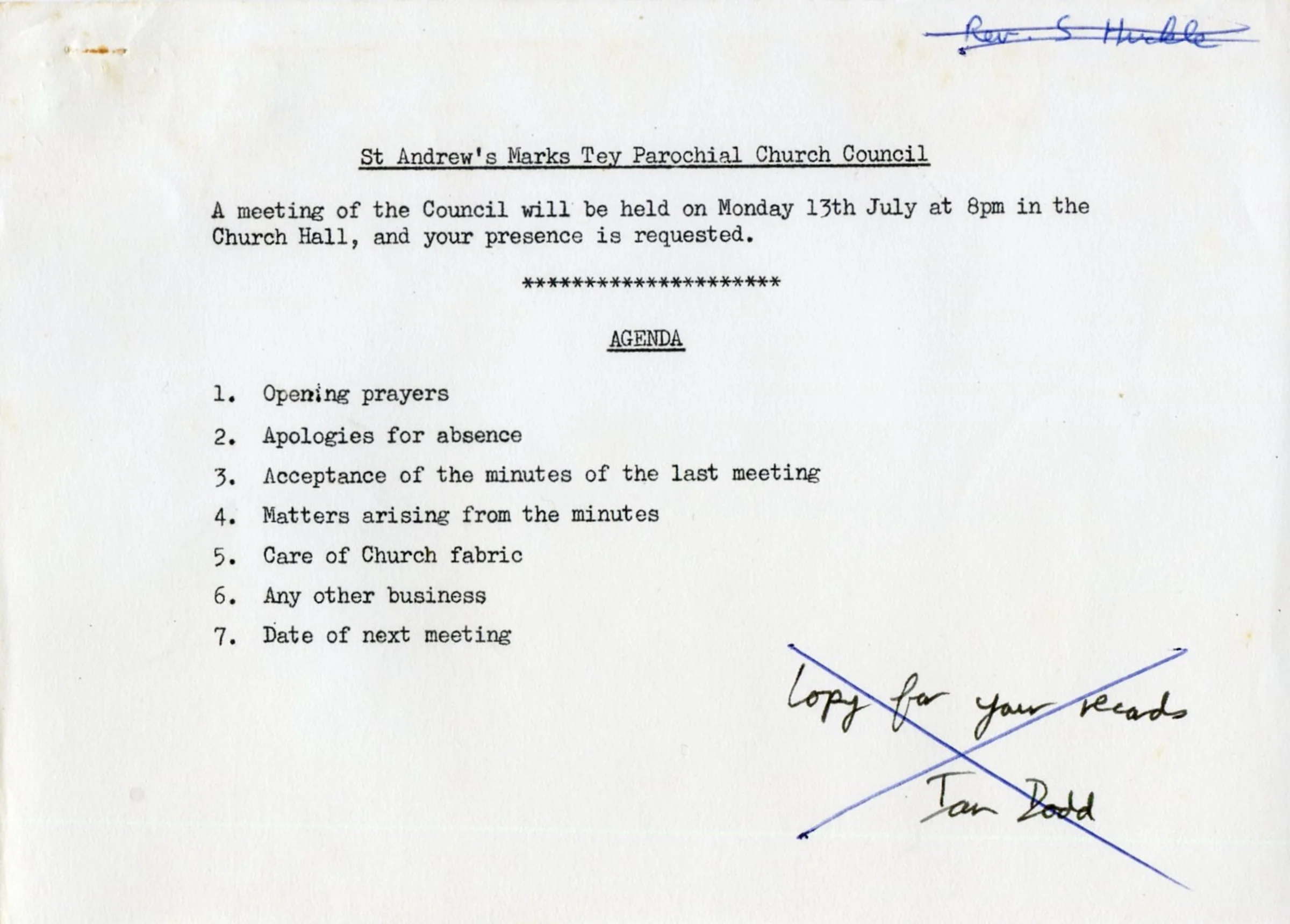 Agenda for the Parochial Church Council meeting, 13th July 1981.