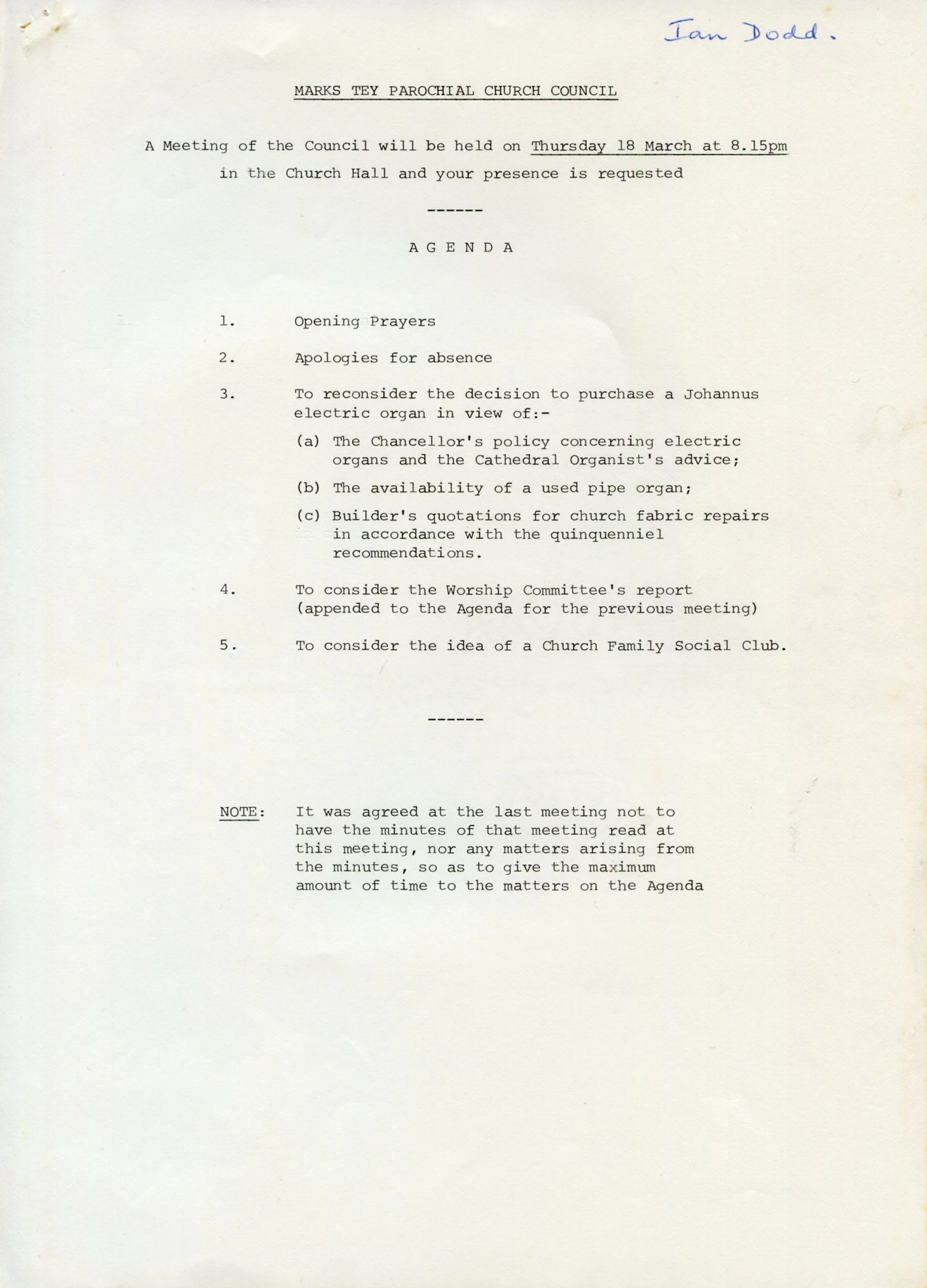 Agenda for the Parochial Church Council meeting, 18th March 1982.