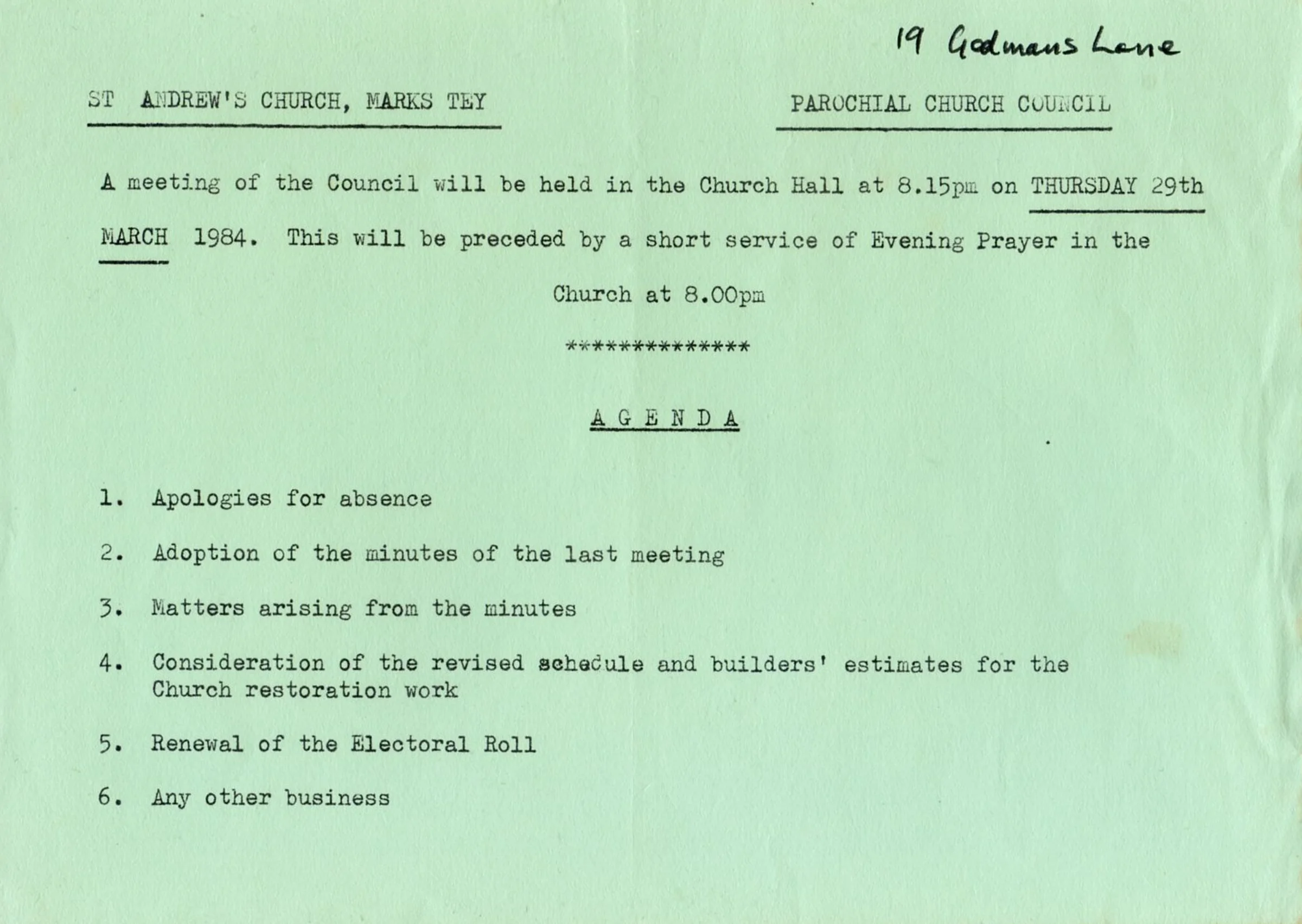 Agenda for the Parochial Church Council meeting, 29th March 1984.