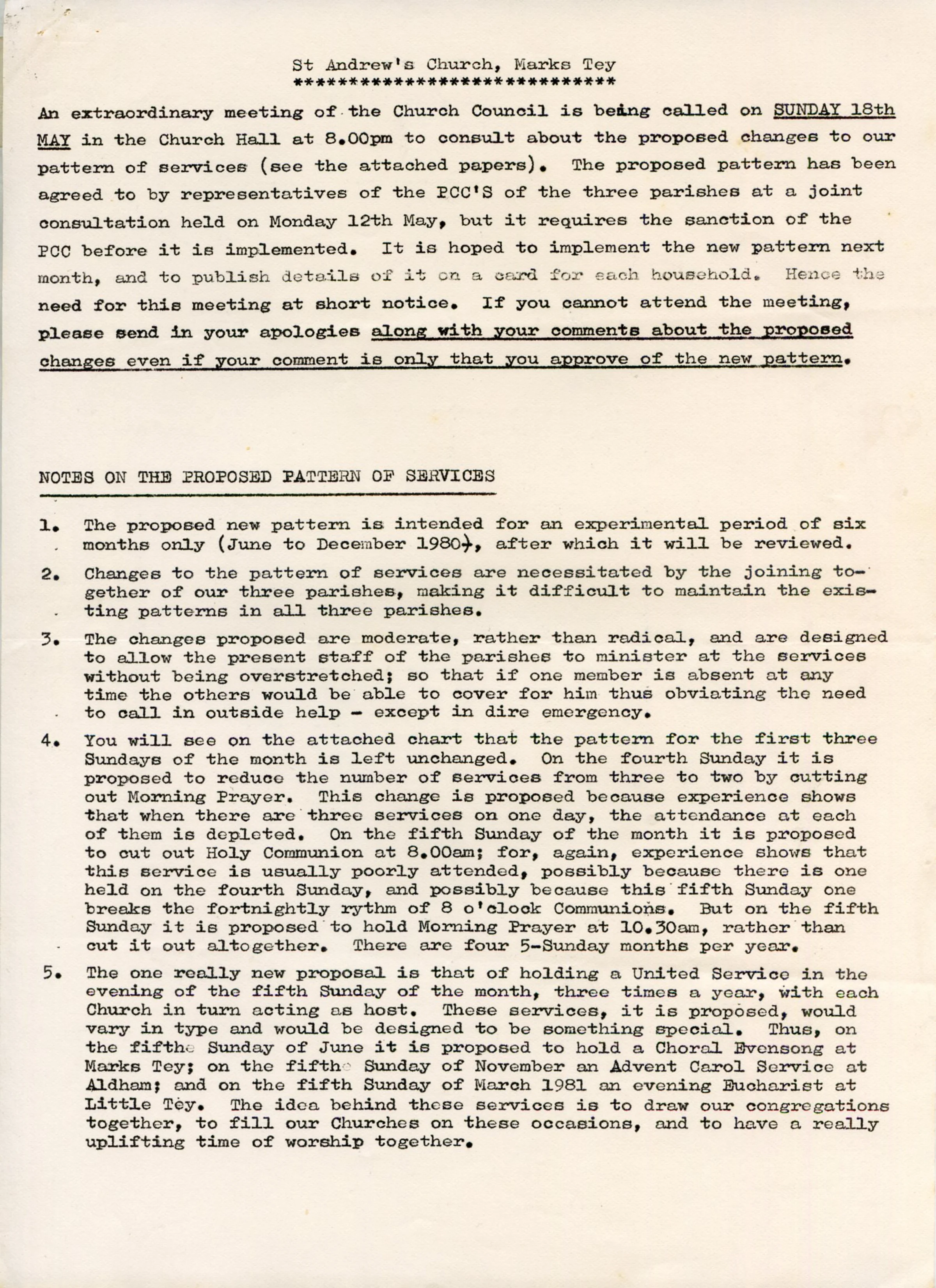 Agenda for an Extraordinary meeting of the Parochial Church Council, 18th May 1980. Page 1 of 3.