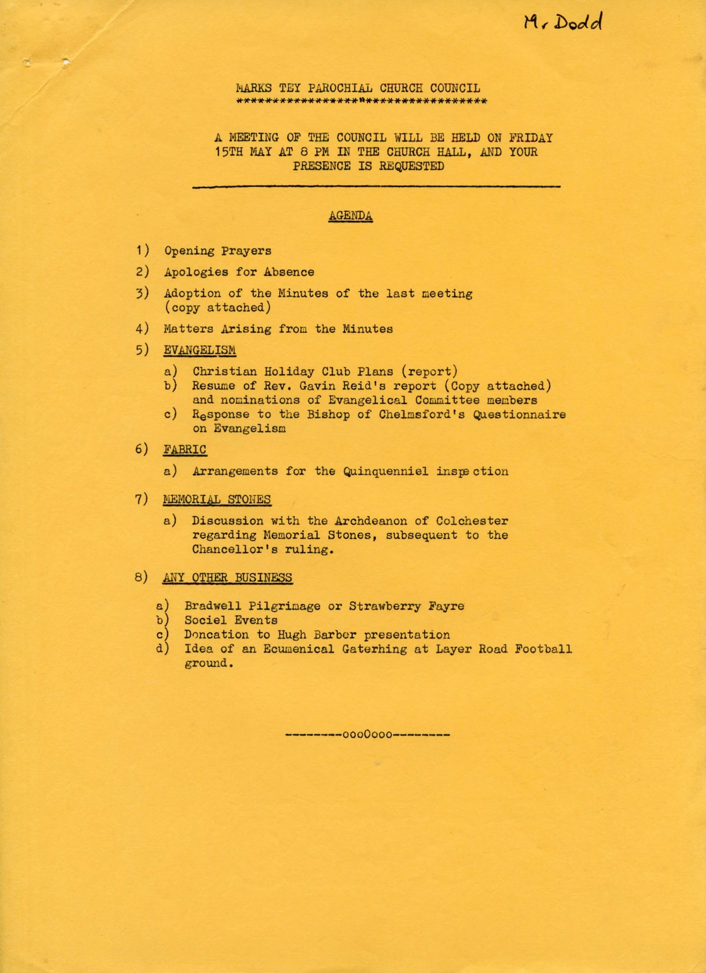 Agenda for the Parochial Church Council meeting, 15th May 1981.