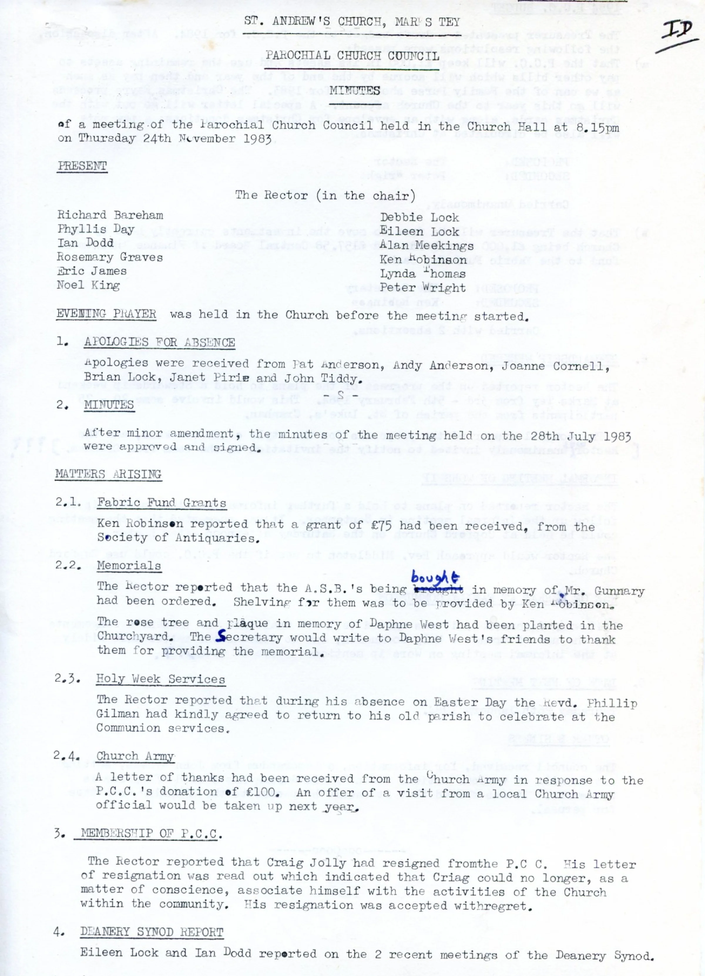 Minutes of the Parochial Church Council meeting, 24th November 1983. Page 1 of 2.
