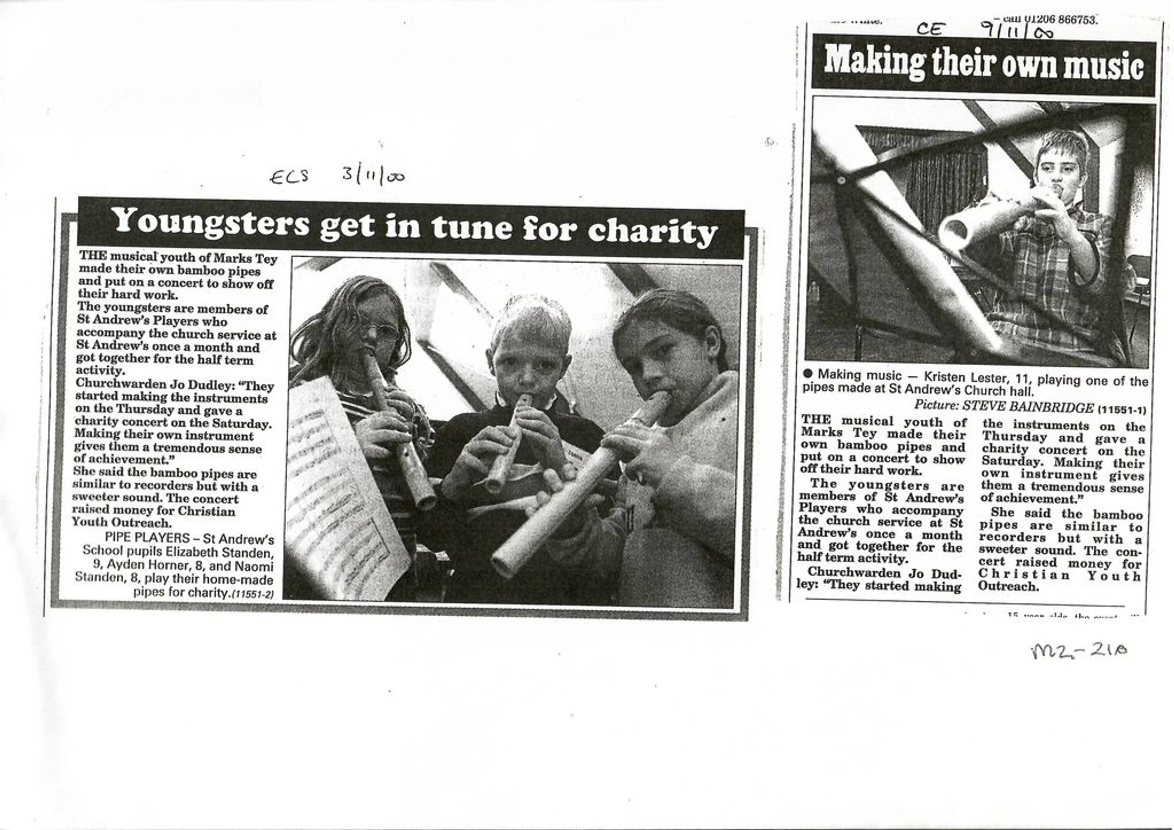 Two short articles with photographs regarding the bamboo pipe concert by St Andrew's Players, November 2000.