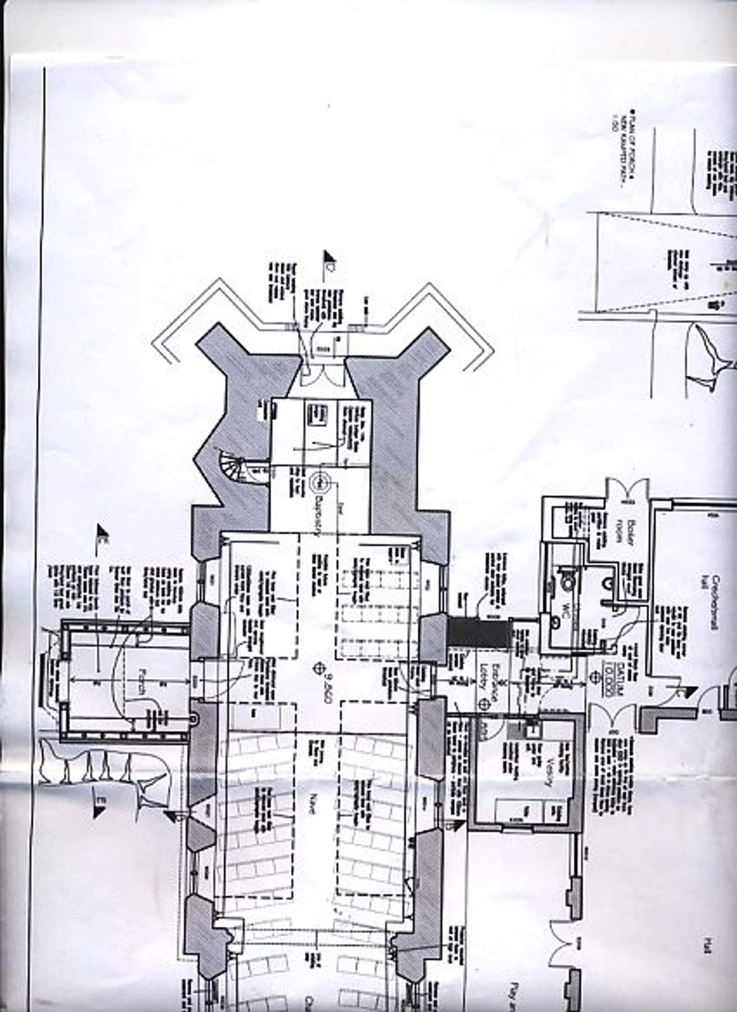 Floor plan of St Andrew's Church prior to remodelling, showing the nave, tower, porch and vestry.