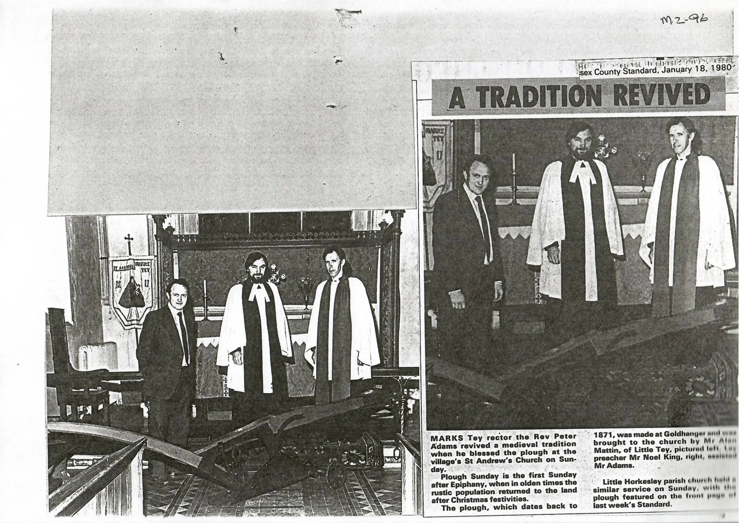 Newspaper article and photograph regarding the Plough Sunday service in St Andrew's Church, 1980.