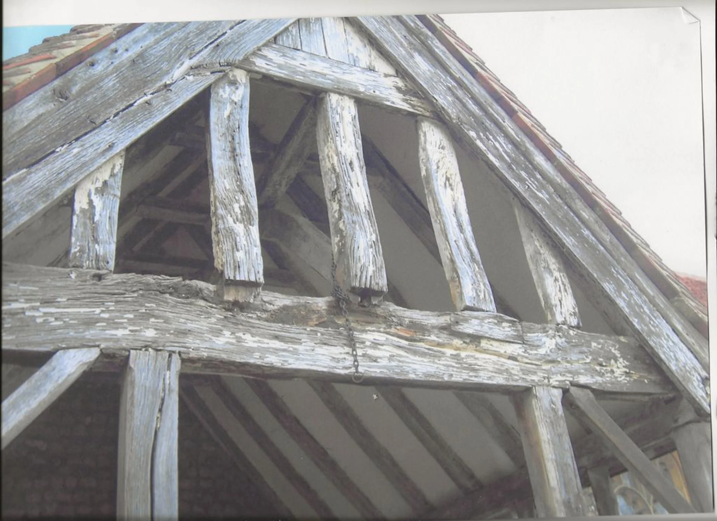 Photograph looking northeast of the central porch beams coming dislodged at the base, at St Andrew's Church.