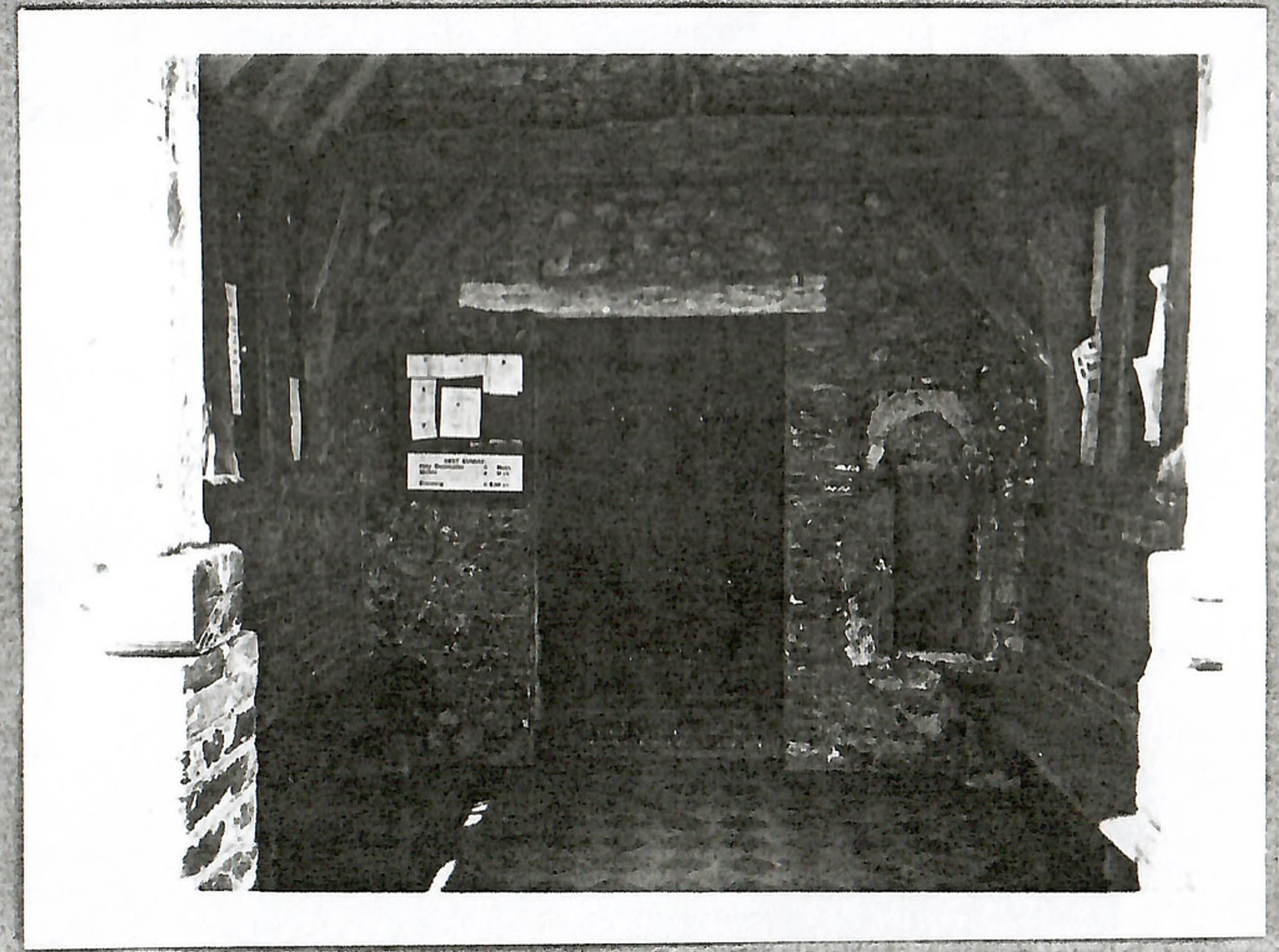 Black and white postcard of the interior of St Andrew's Church porch, held by the National Monuments Record. Undated.