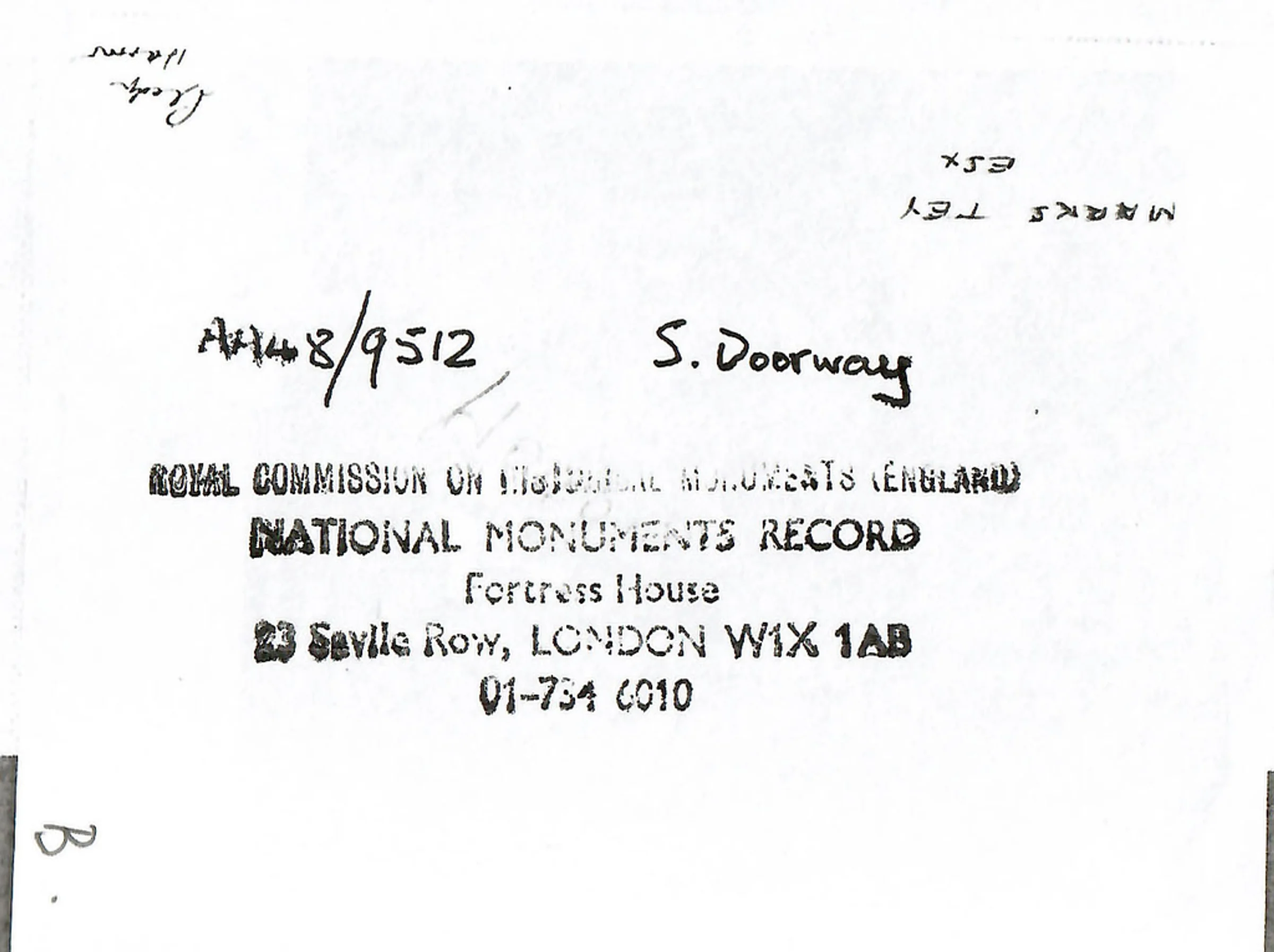 Reverse of a black and white postcard of the church porch interior, held by the National Monuments Record.