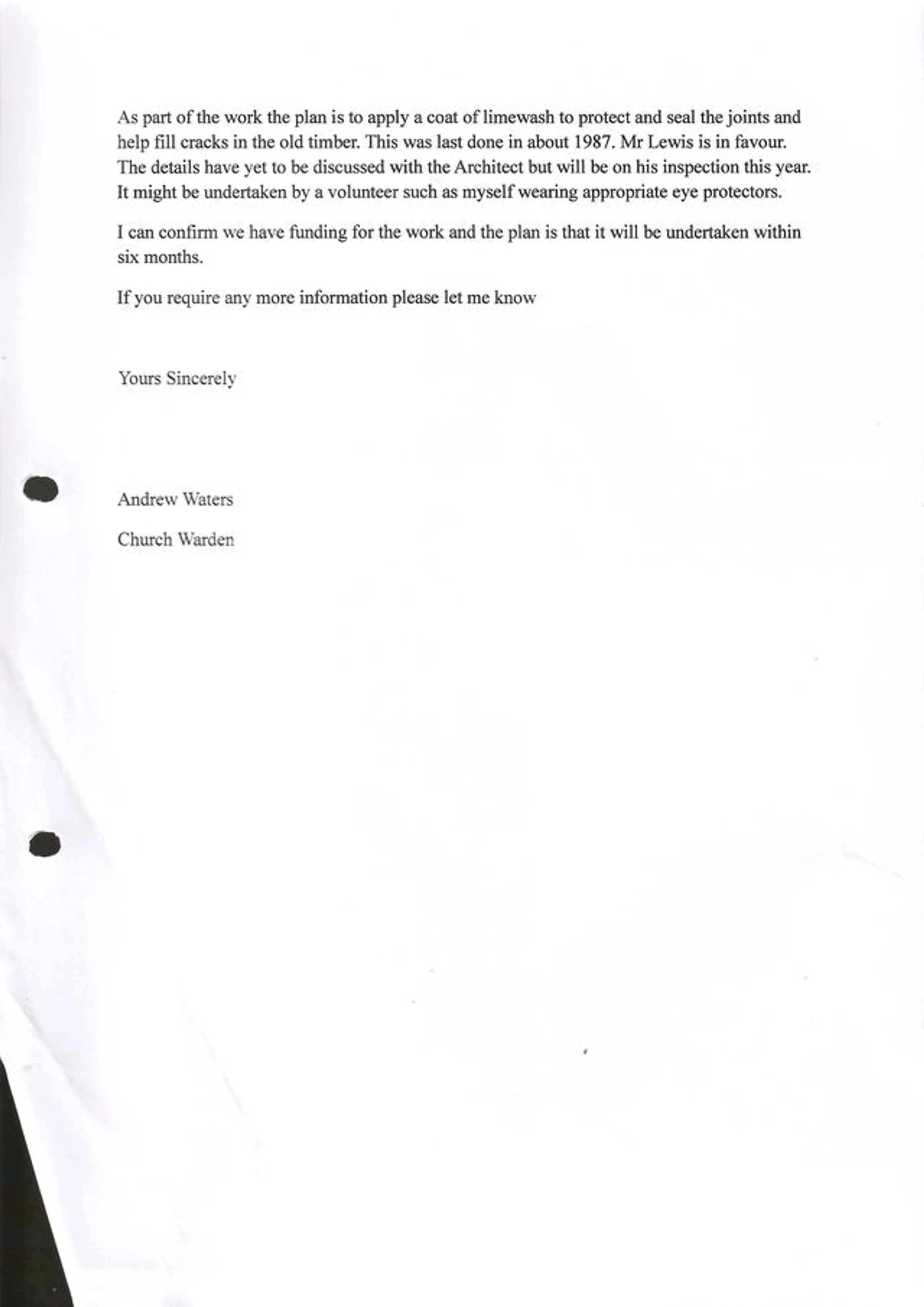 Letter from Andrew Waters to the archdeacon regarding repair work to the porch, dated 17th April 2018. Page 2 of 2.