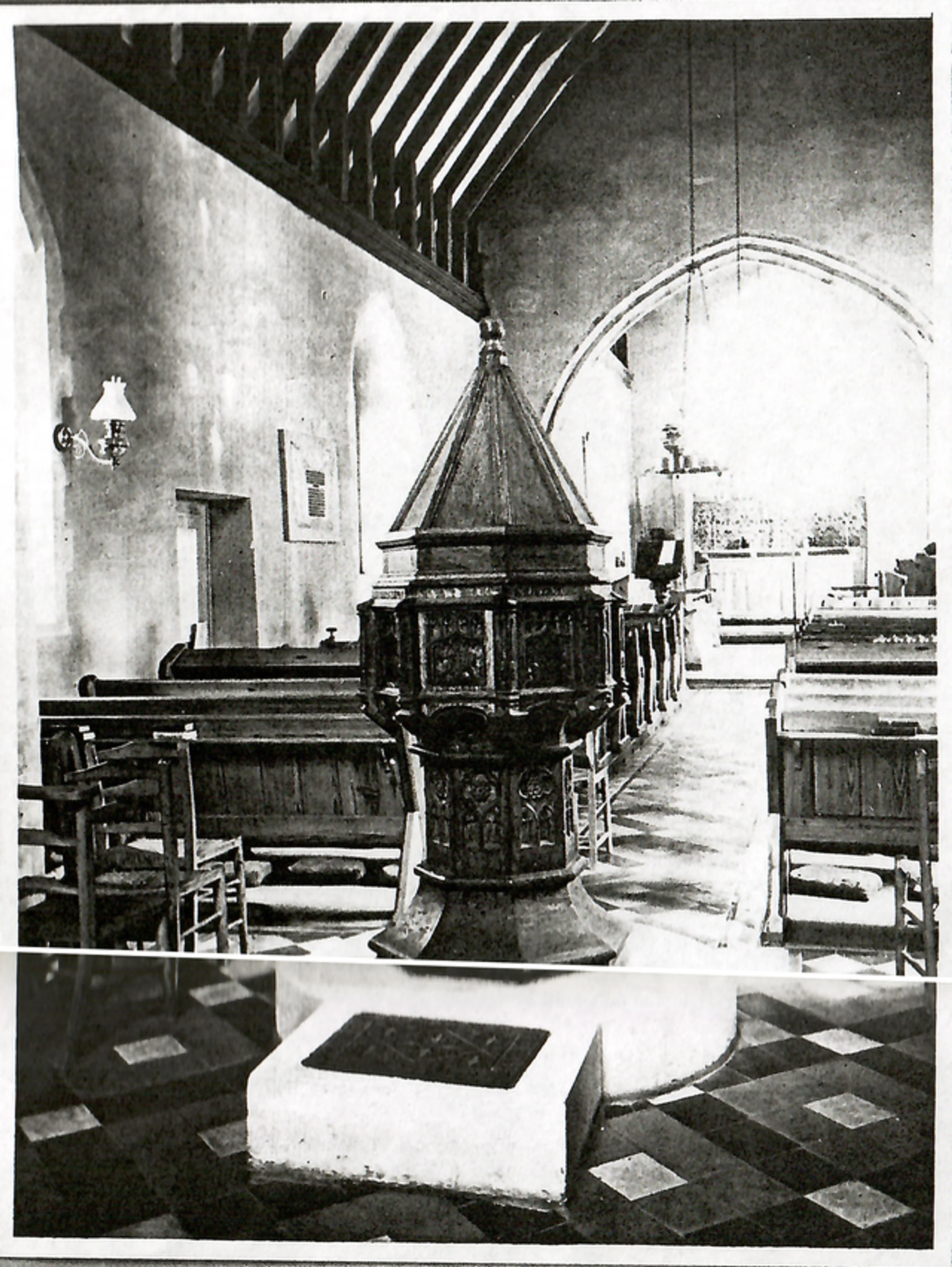 Black and white postcard of the font and nave, held by the National Monuments Record, dated 1925.
