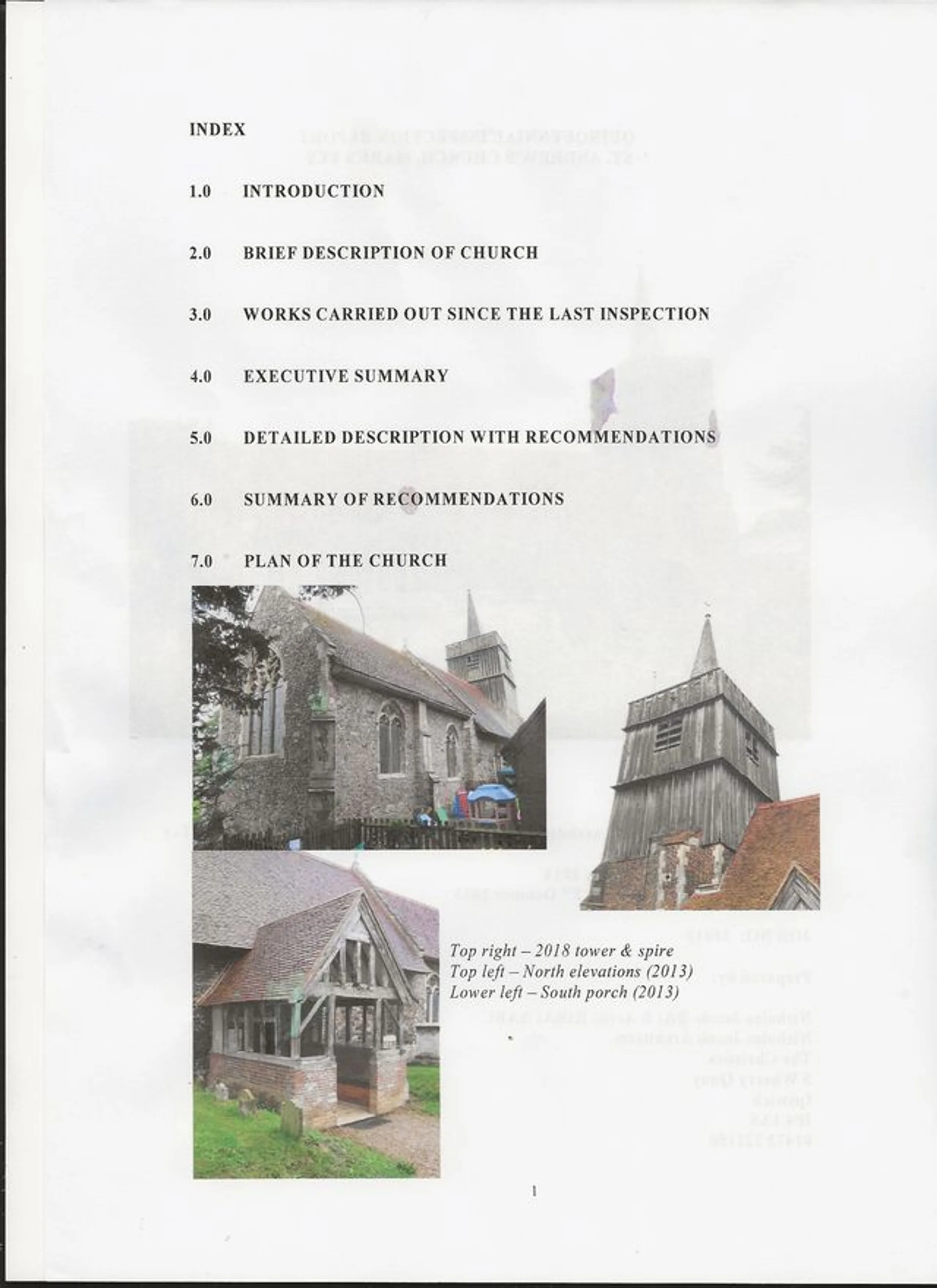 Page 1 of the Quinquennial Inspection Report for St Andrew's Church 2018, by Nicholas Jacob Architects on 23rd May 2018.