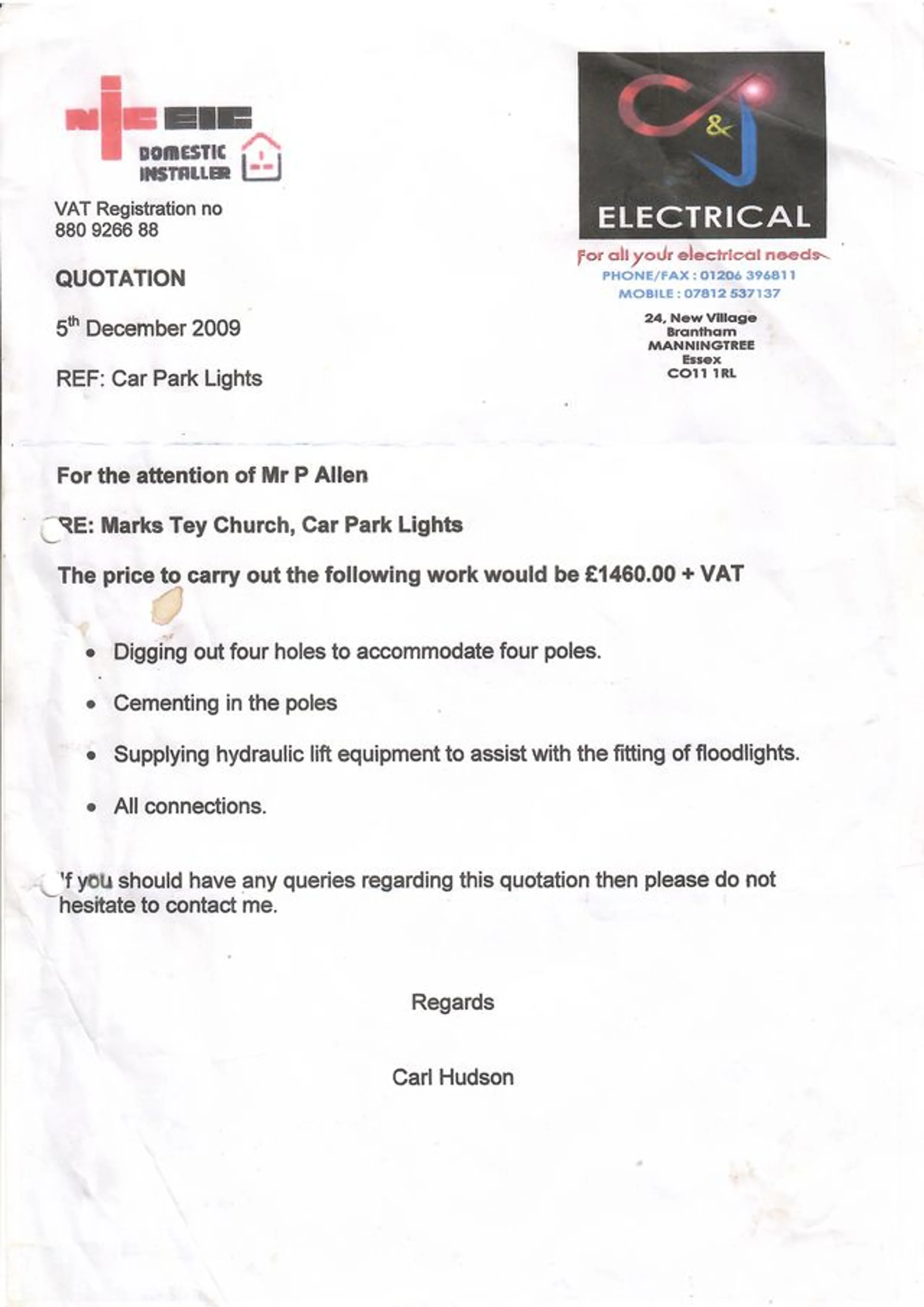 Estimate for the installation of car park lights from C & J Electrical, dated 5th December 2009. FAO Mr P Allen.
