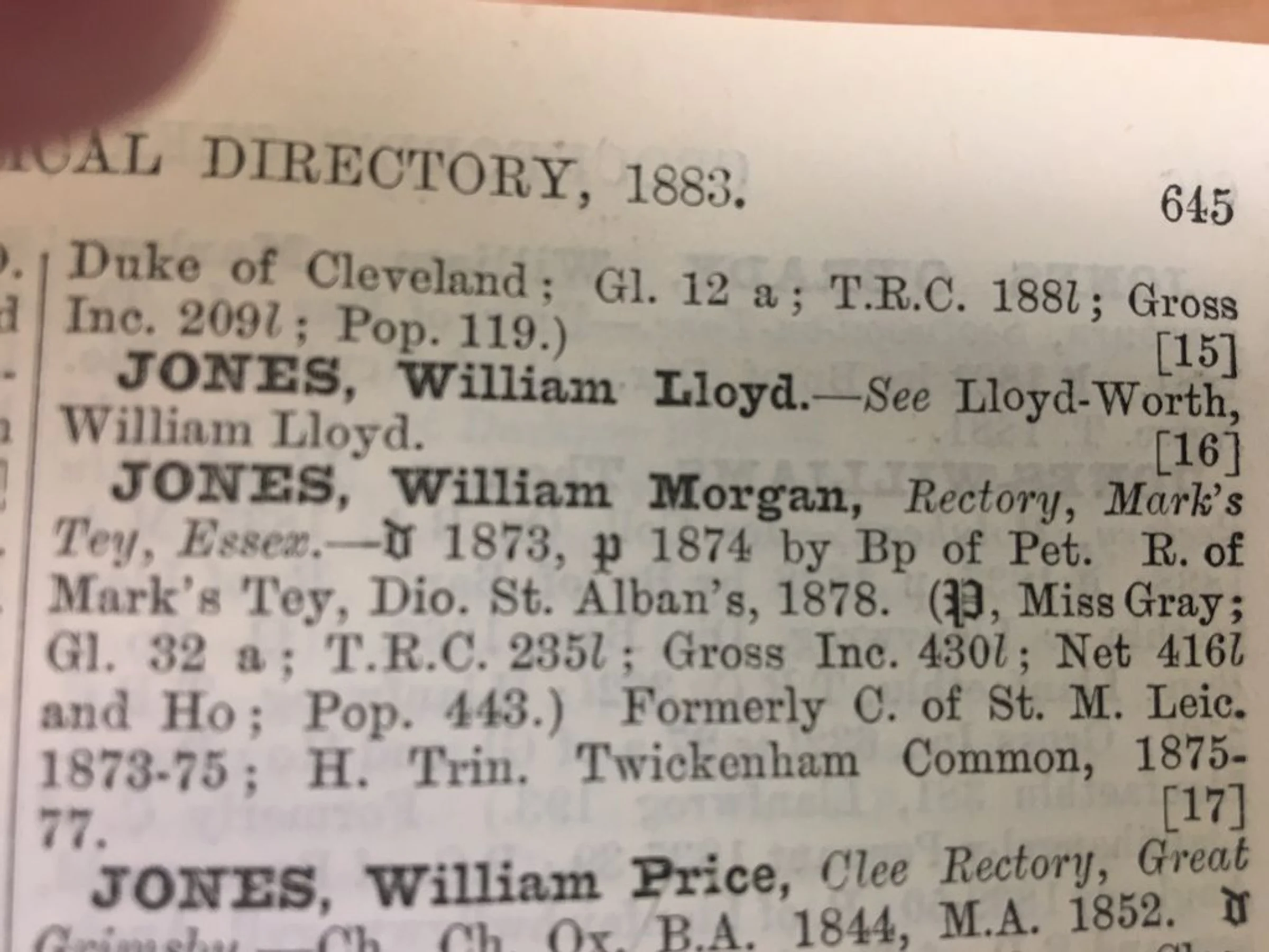 Published listing of the income of William Morgan Jones, Rector of Marks Tey in the Clerical Directory 1883, p 645.
