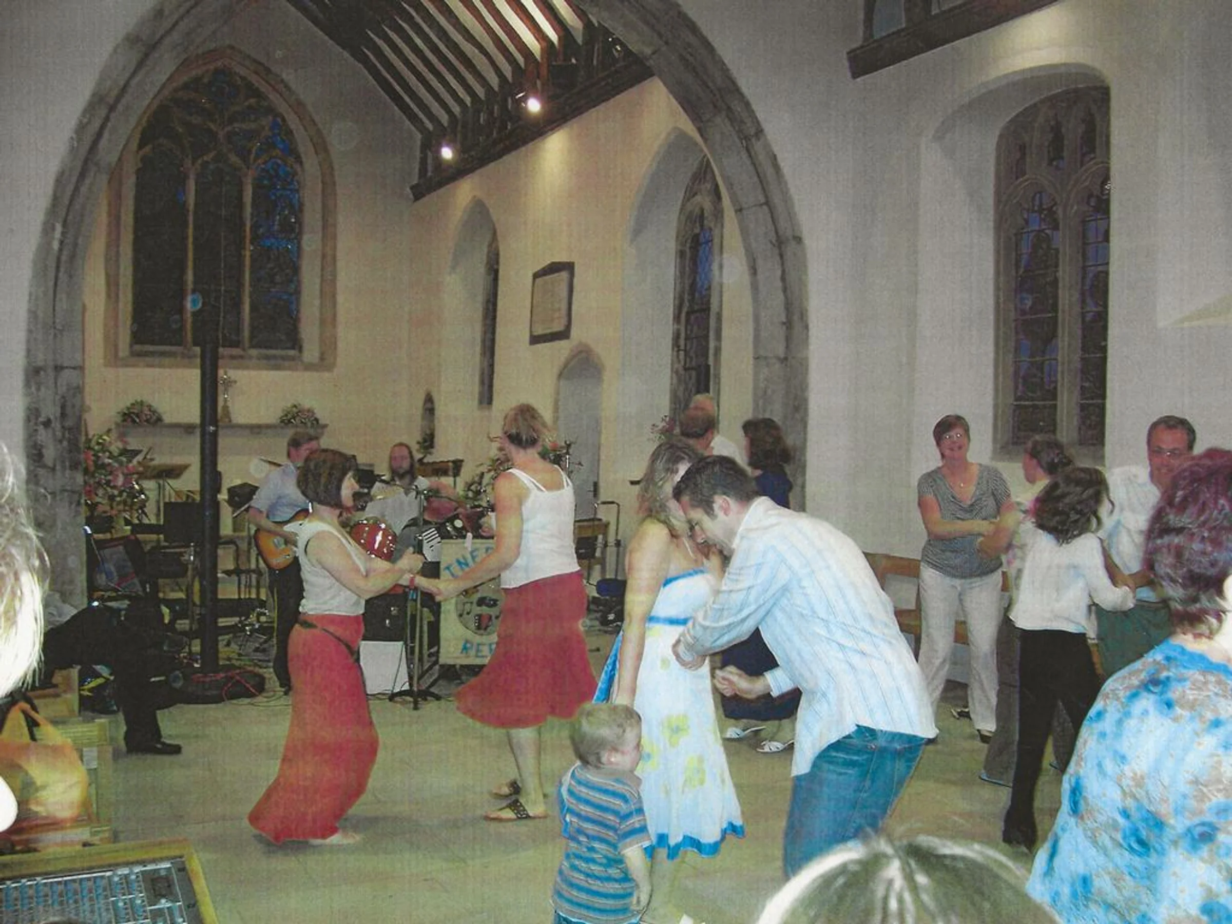 Photograph looking through the church of a barn dance, following the reordering of t Andrew's Church.