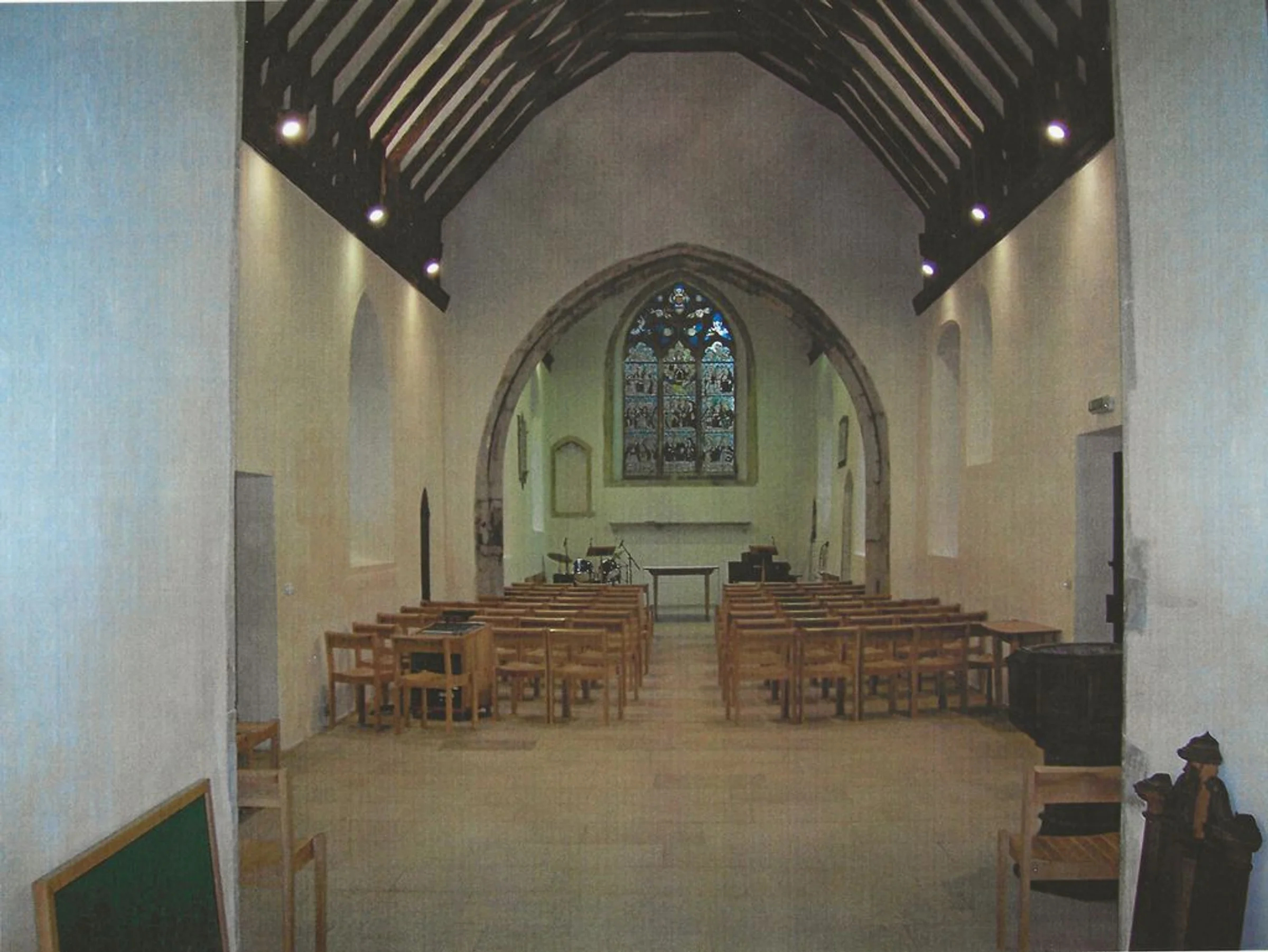 Photograph looking east taken from the west doors showing the reordering complete and chairs in the nave. During 2007 reordering.