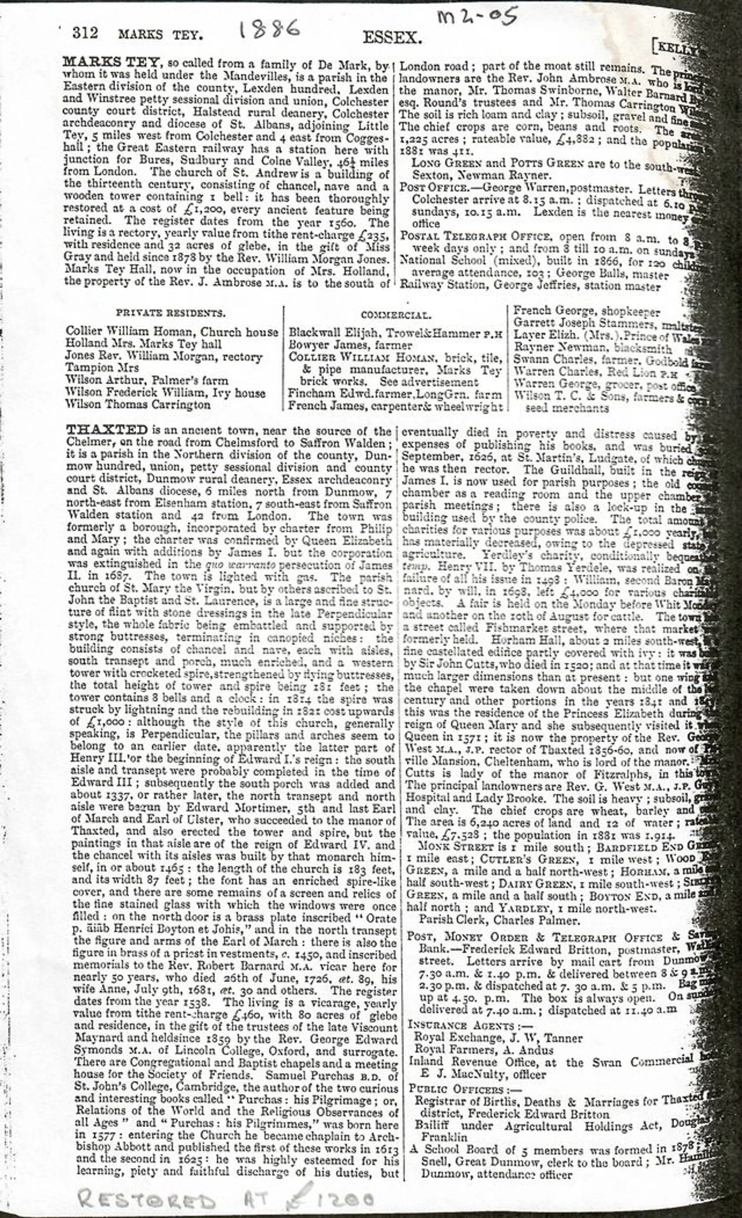 Description of St Andrew's Church following the restoration, in the Kelly's Directory of 1886, p312.