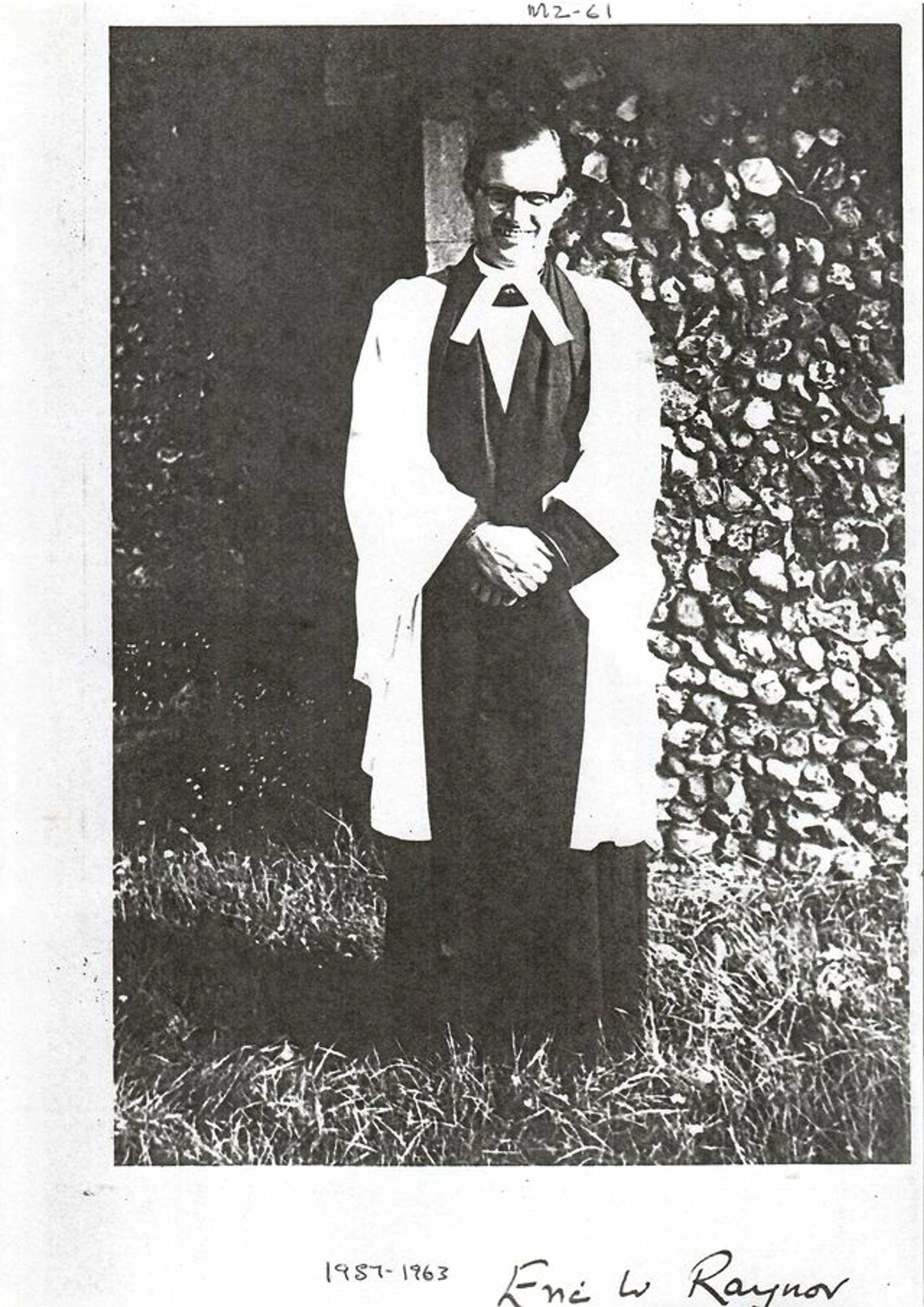 Black and white photograph of Rev Eric Rayner standing outside St Andrew's Church, Rev in Marks Tey between 1957 and 1963.