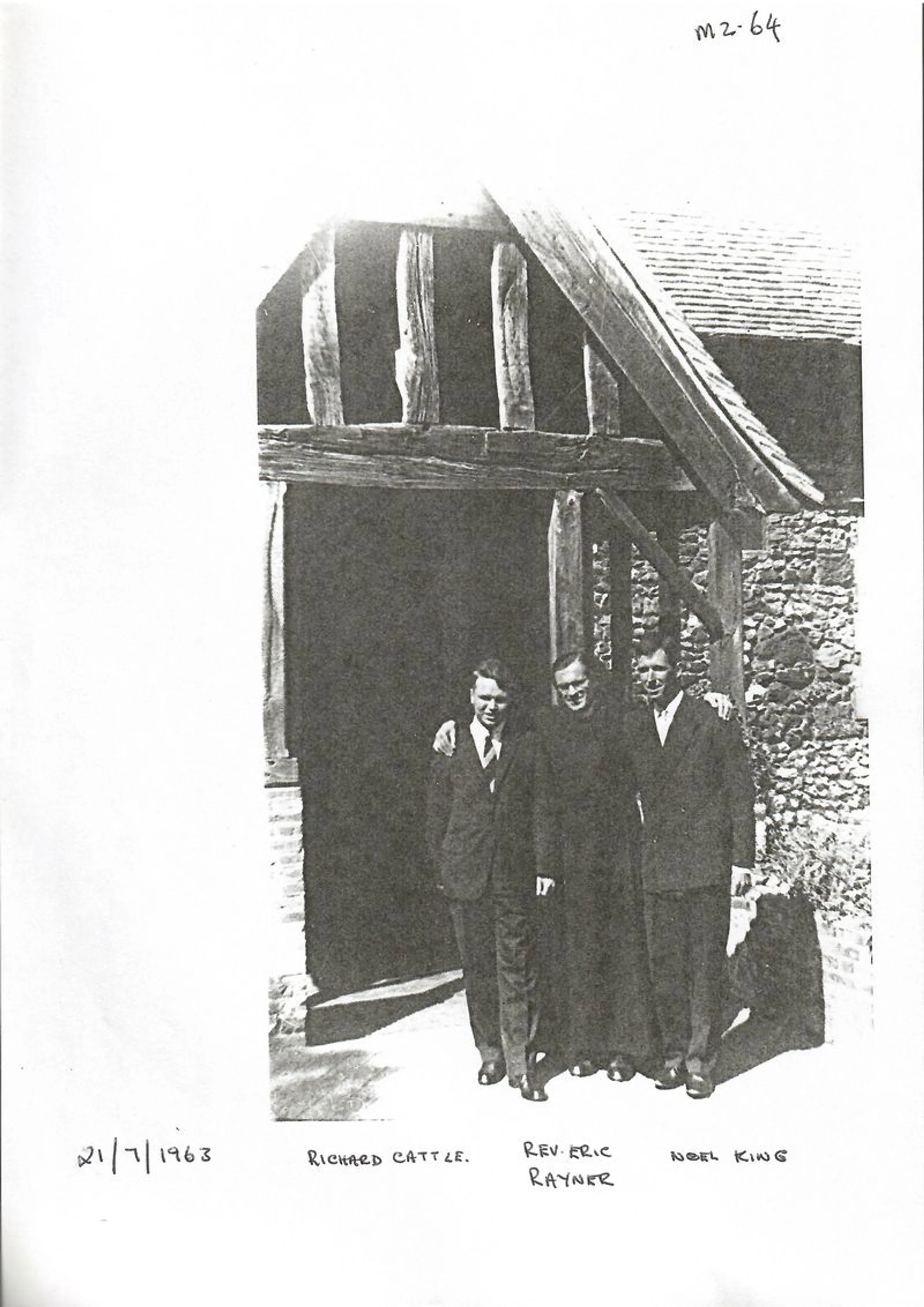 Black and white photograph of Rev Eric Rayner with Richard Cattle and Noel King outside St Andrew's Church, 21st July 1963.