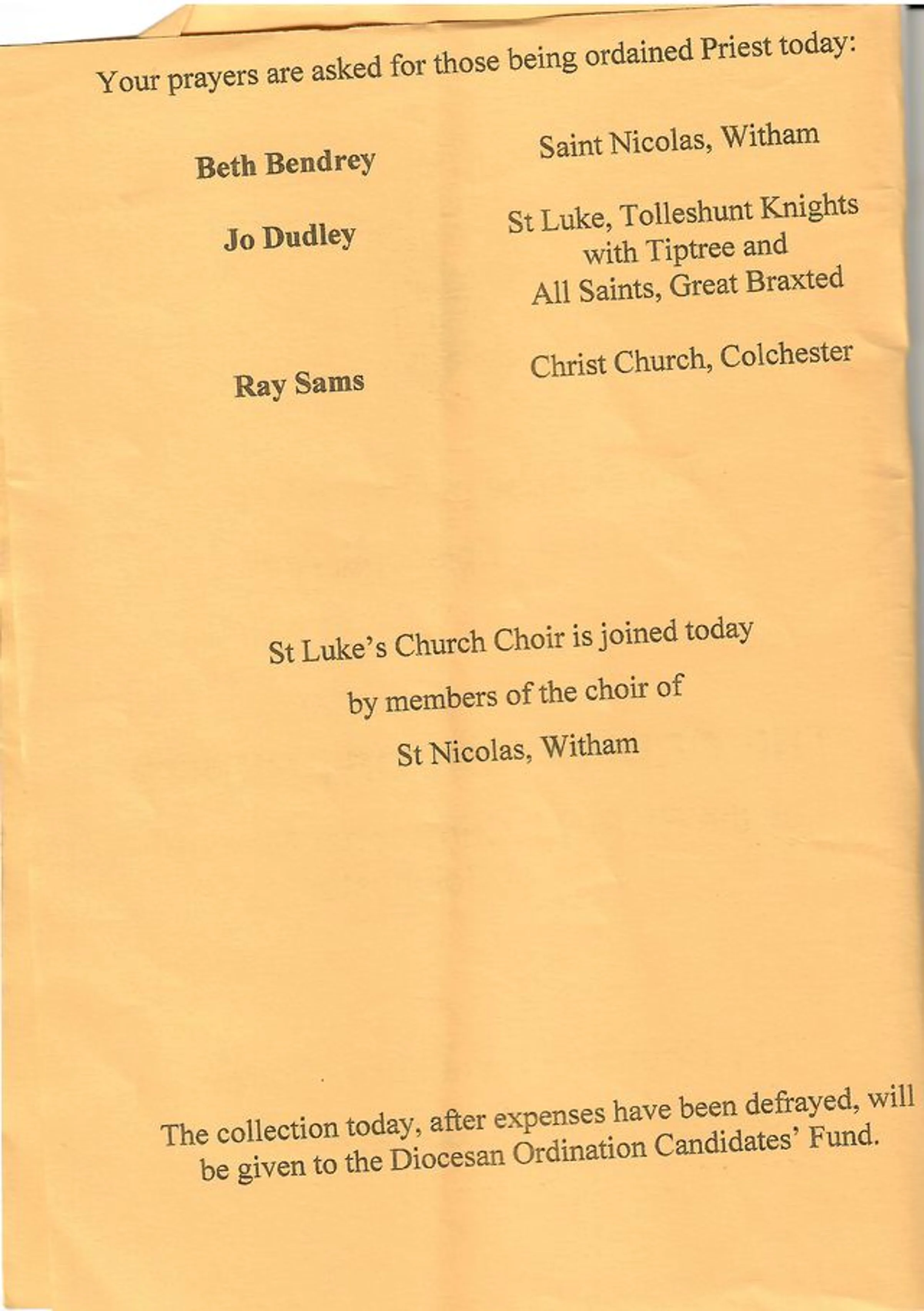 Service sheet from "The Ordination of Priests" in Tiptree, including Rev Jo Dudley, 24th June 2007. Page 2 of 2.