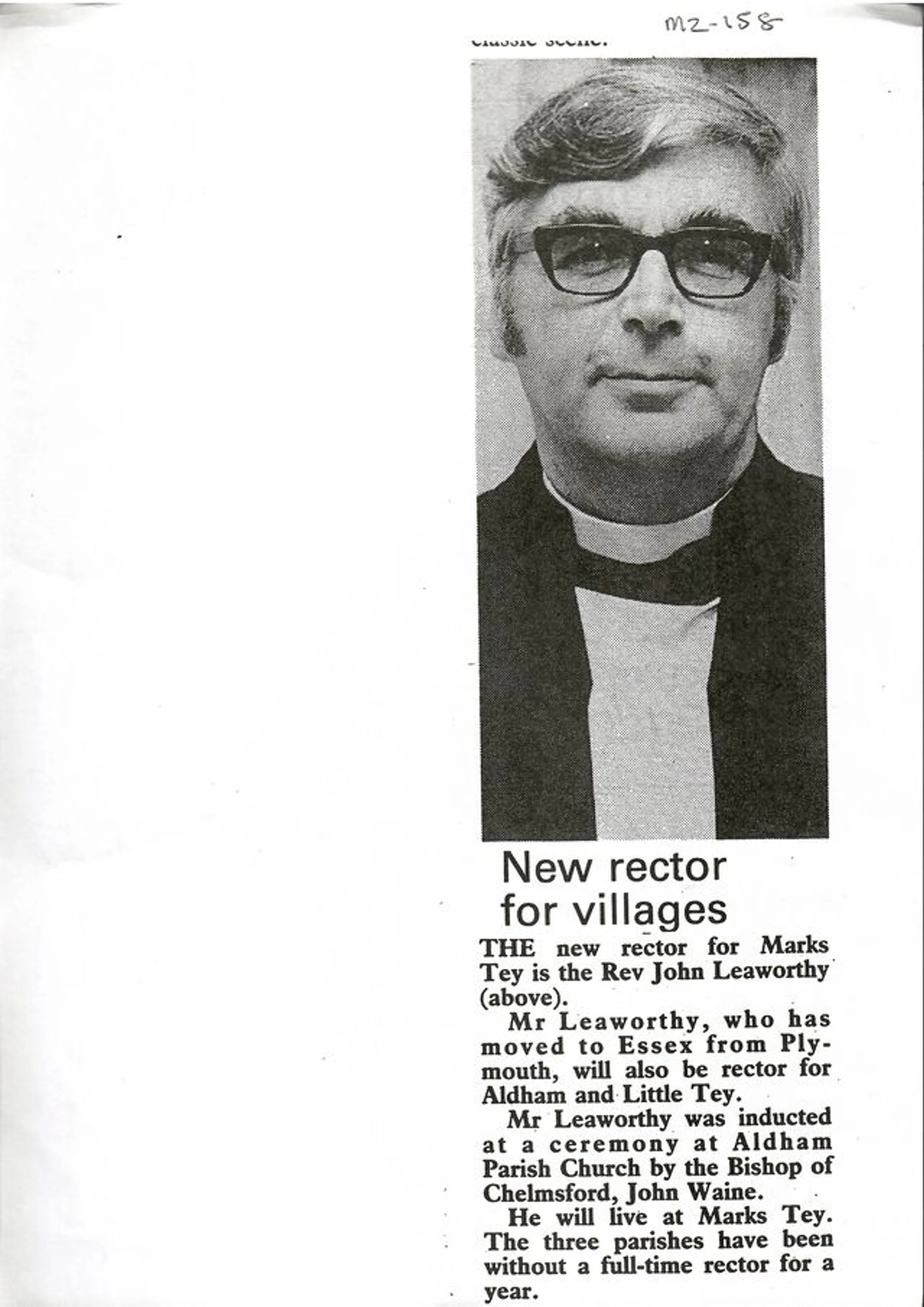 Article and photograph regarding the new rector for Marks Tey, ALdham and Little Tey, Rev John Leaworthy.
