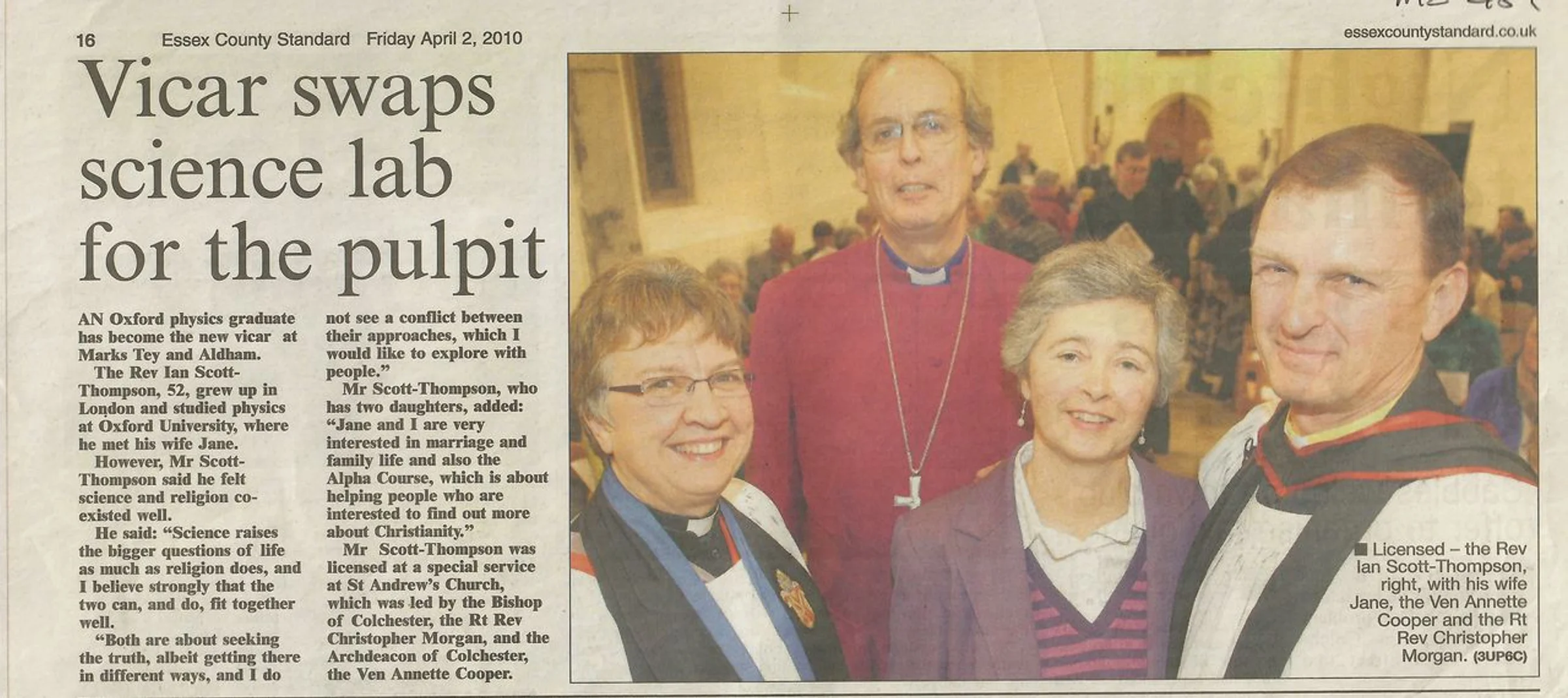 Article with photograph regarding the licensing of Rev Ian Scott-Thompson as vicar of Marks Tey and Aldham, 2nd April 2010.