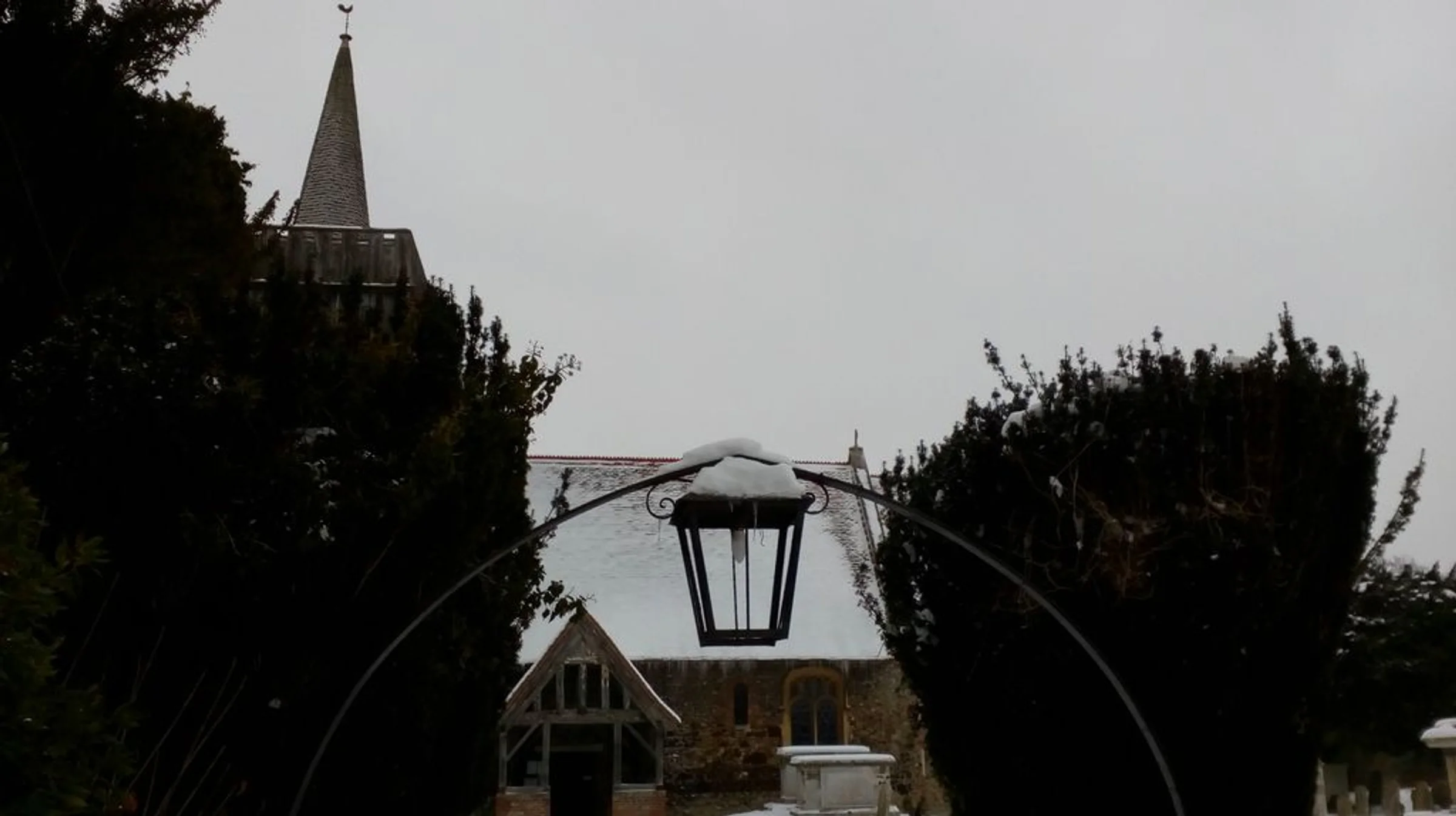 Photograph from the churchyard arch towards the church and snow covered nave roof.