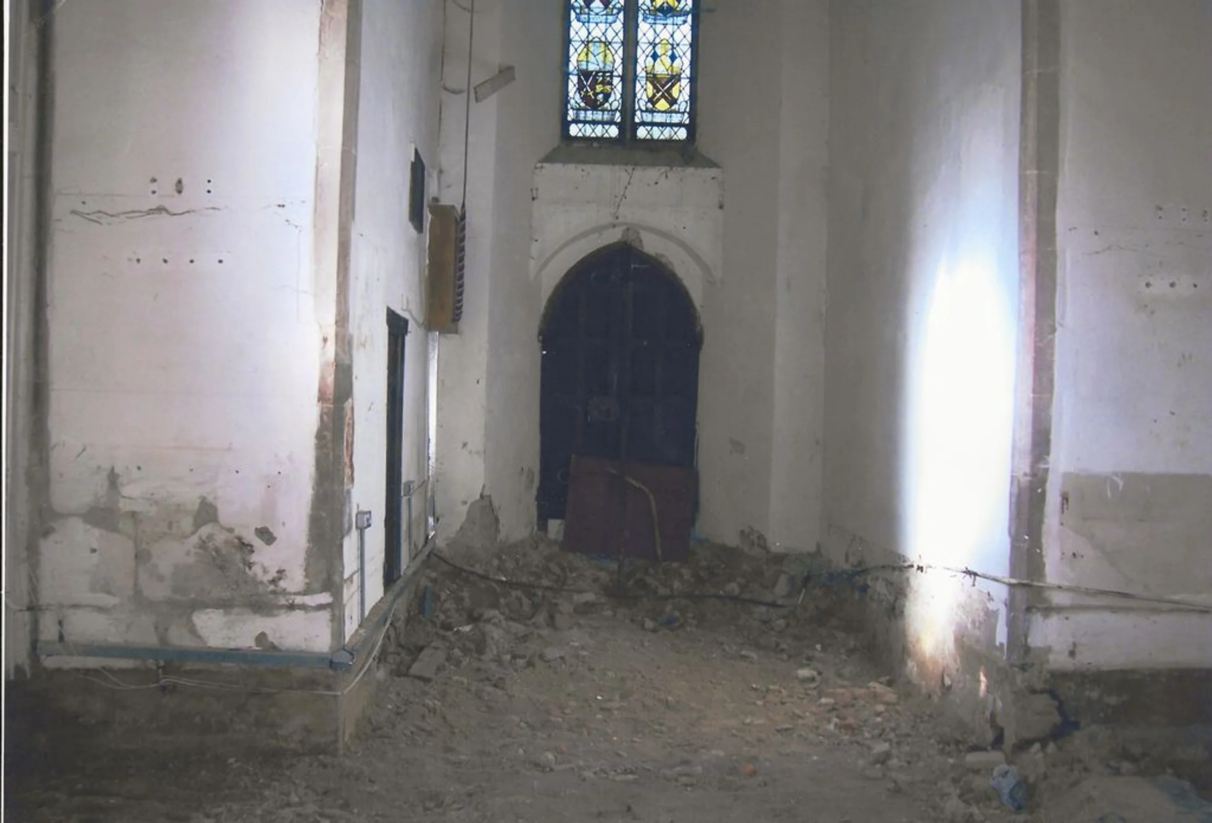 Photograph looking west of the levelled floor of the tower and rubble, taken during the reordering.