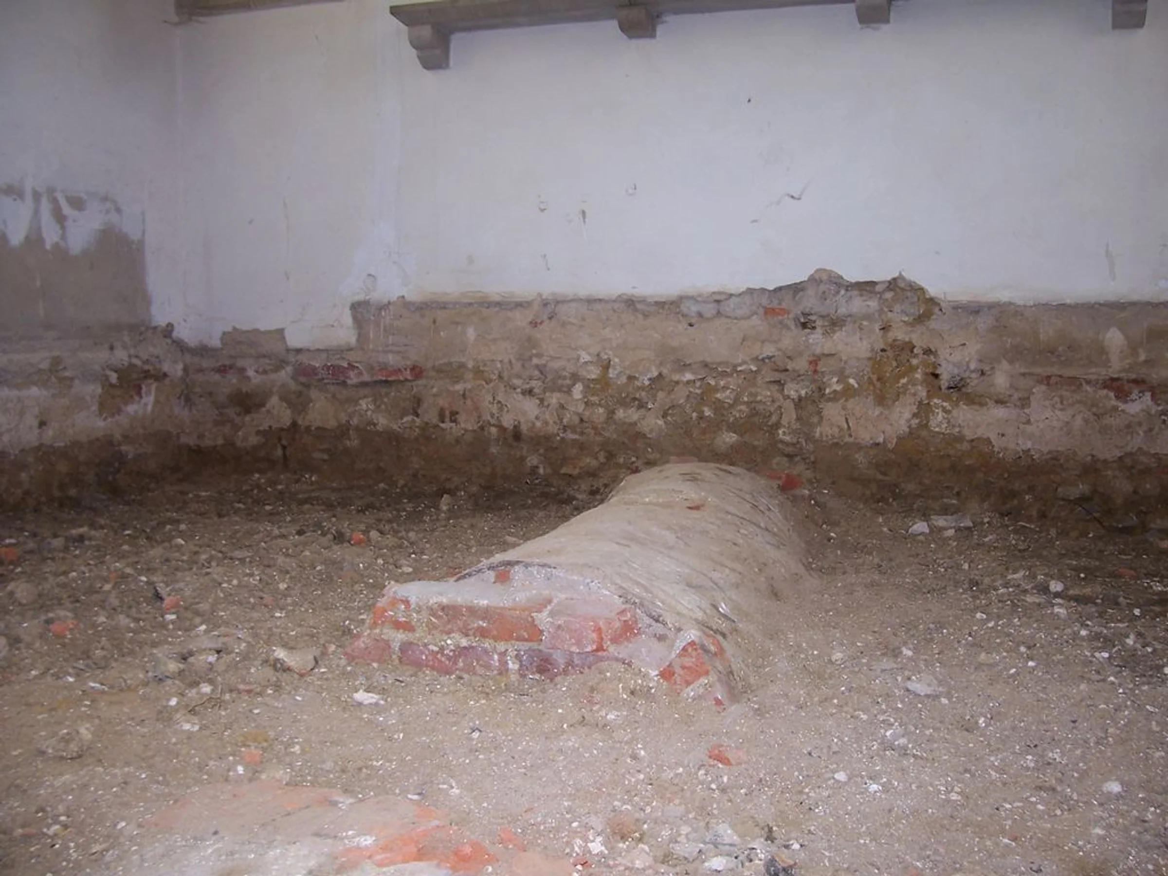 Photograph of the excavated floor of the sanctuary looking east, including a bricked grave, taken during the reordering.