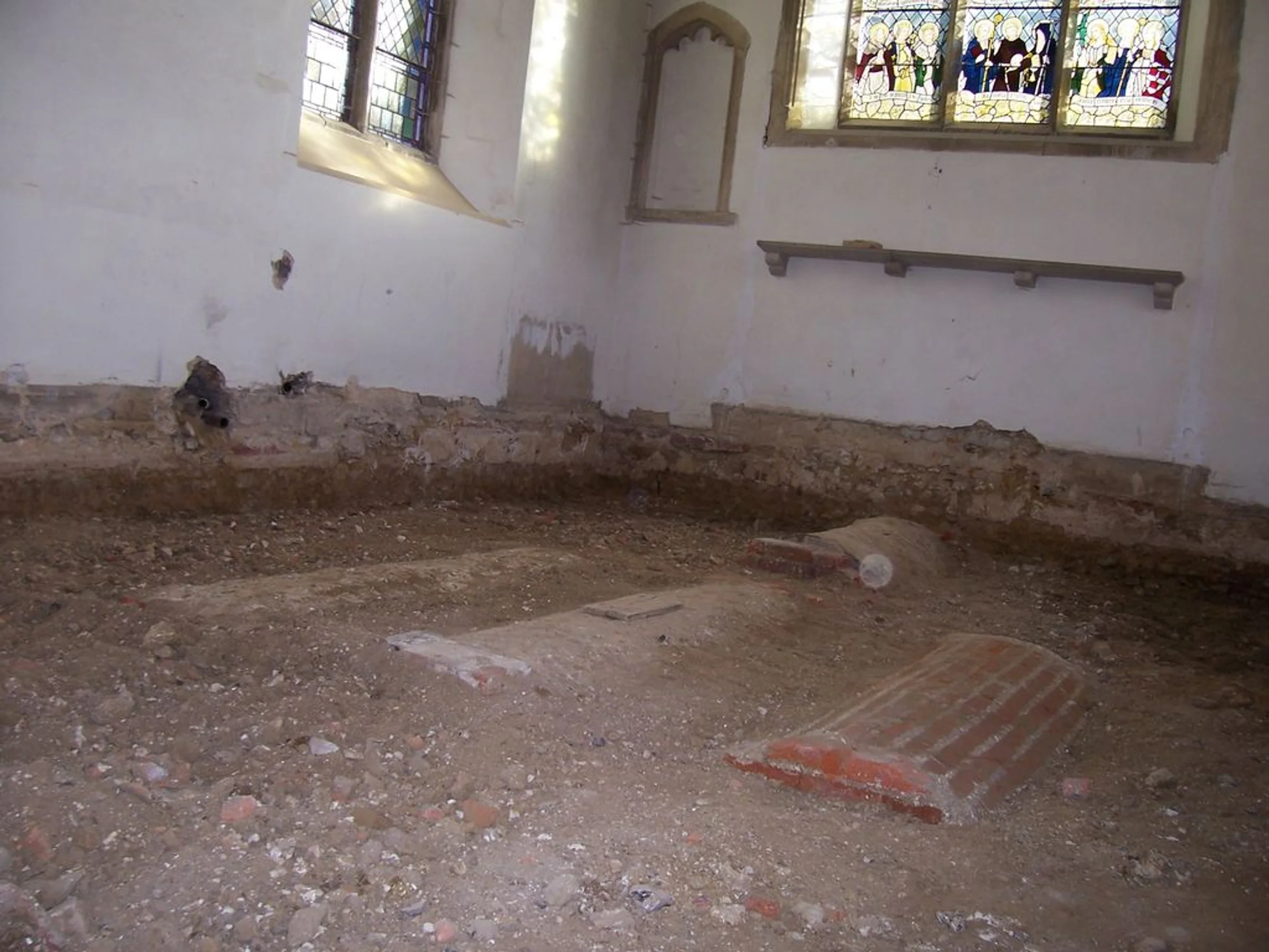 Photograph looking northeast of the excavated sanctuary floor showing four graves, during the reordering.