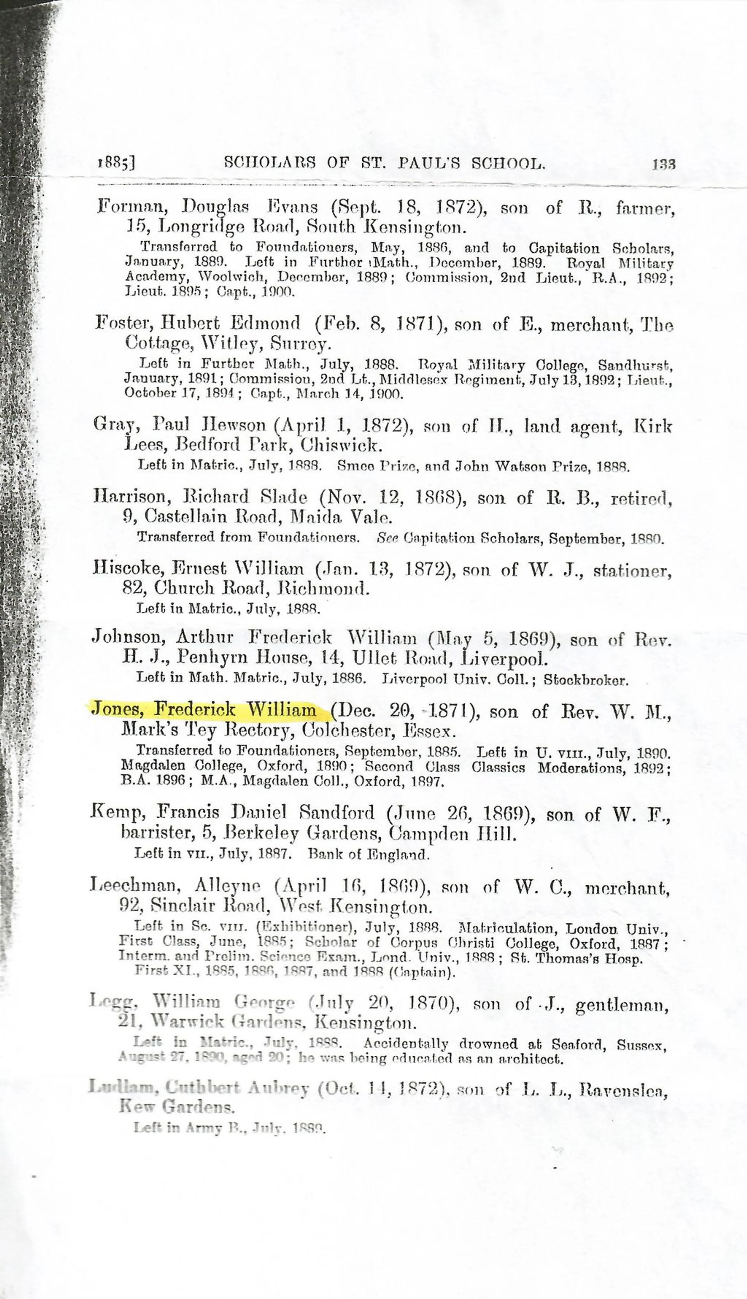 List of scholars of St Paul's School of 1885 including William Frederick Jones son of Rev. W. M. Jones of Marks Tey Rectory.