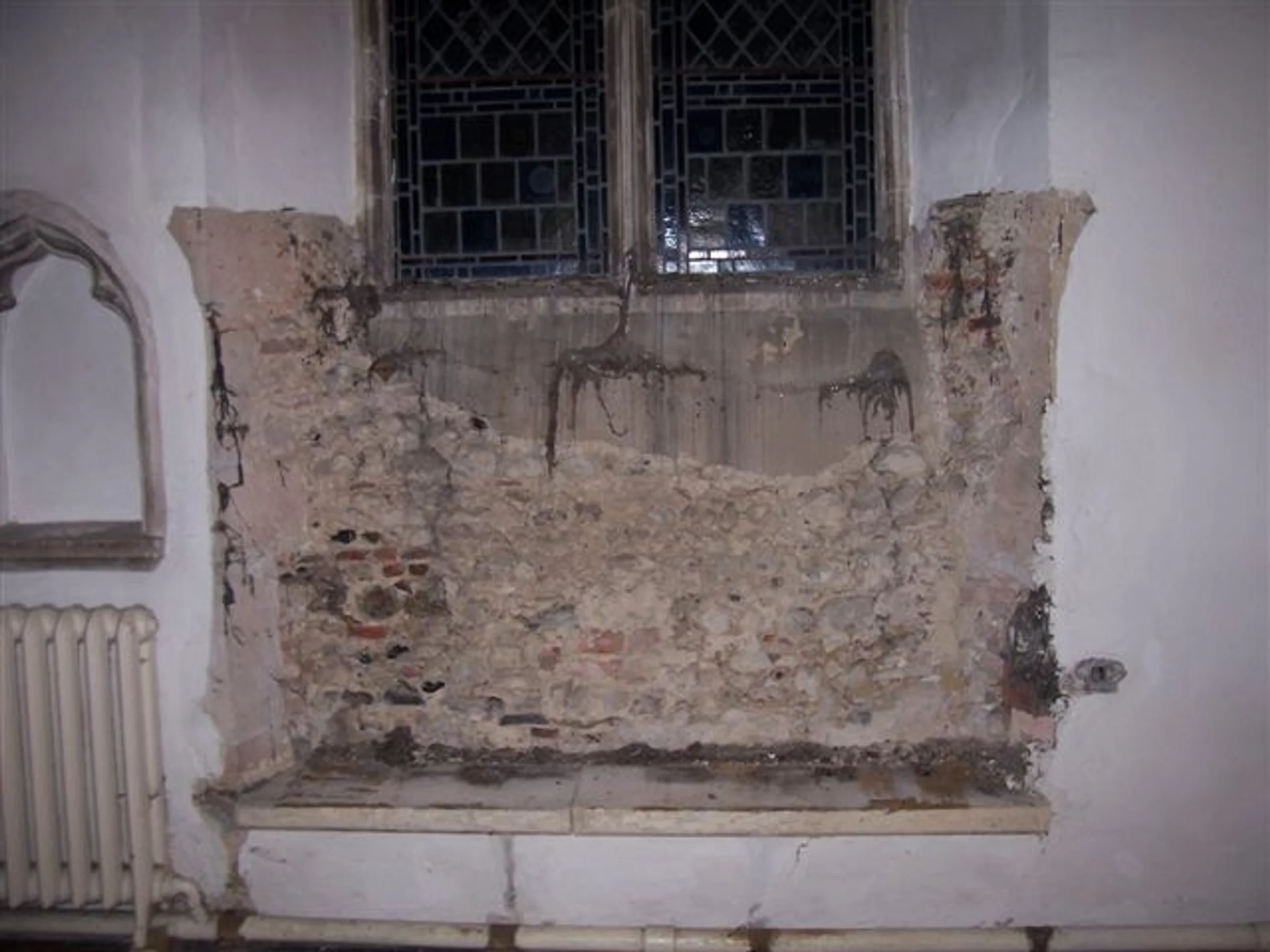 Photograph looking south of the space for the sedilia seats in the sanctuary, removed during the reordering.