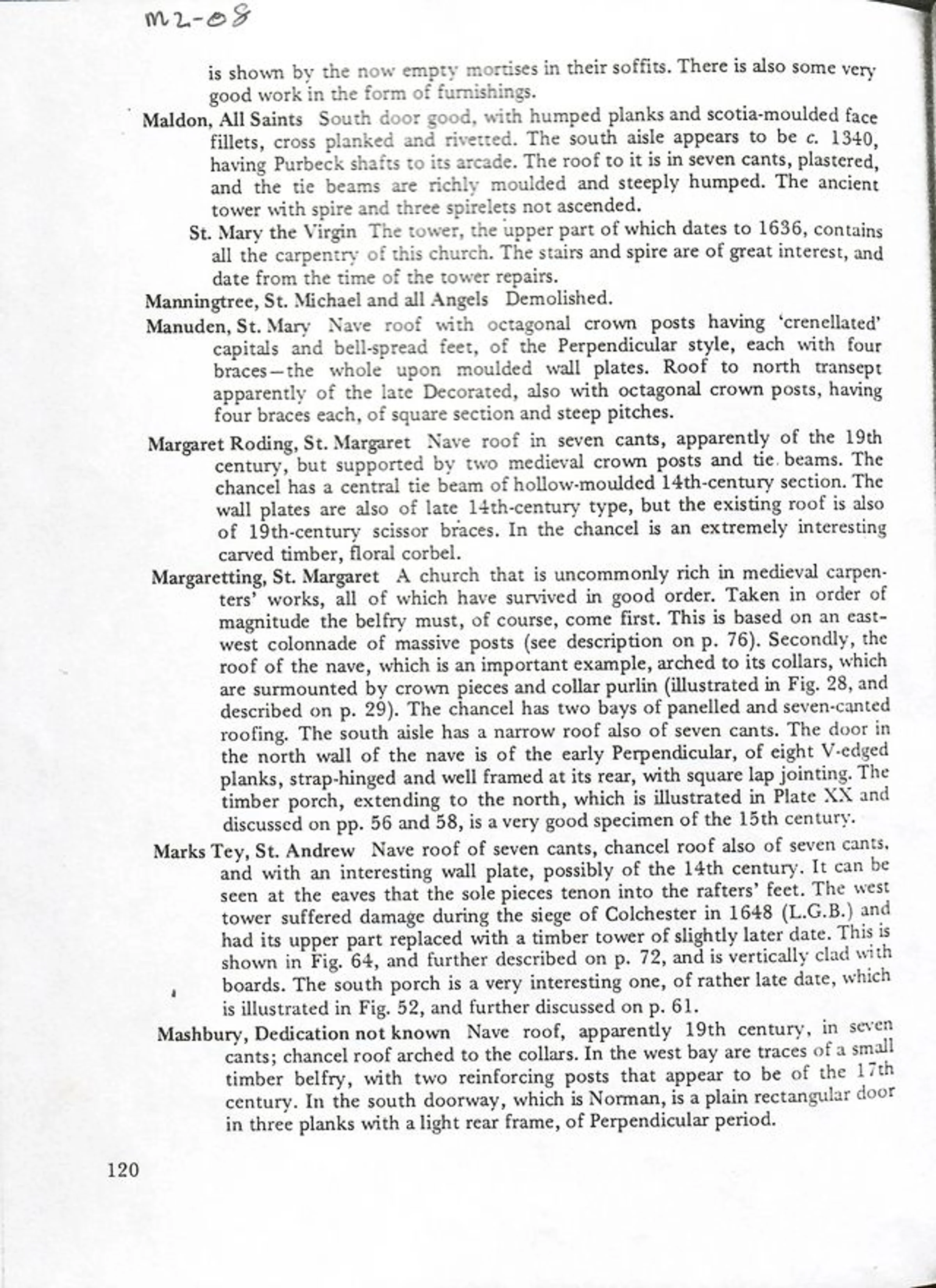 Published summary of St Andrew's Church architecture with reference to the damage to the tower during the 1648 siege of Colchester. Hewett "English Church Carpentry" p120