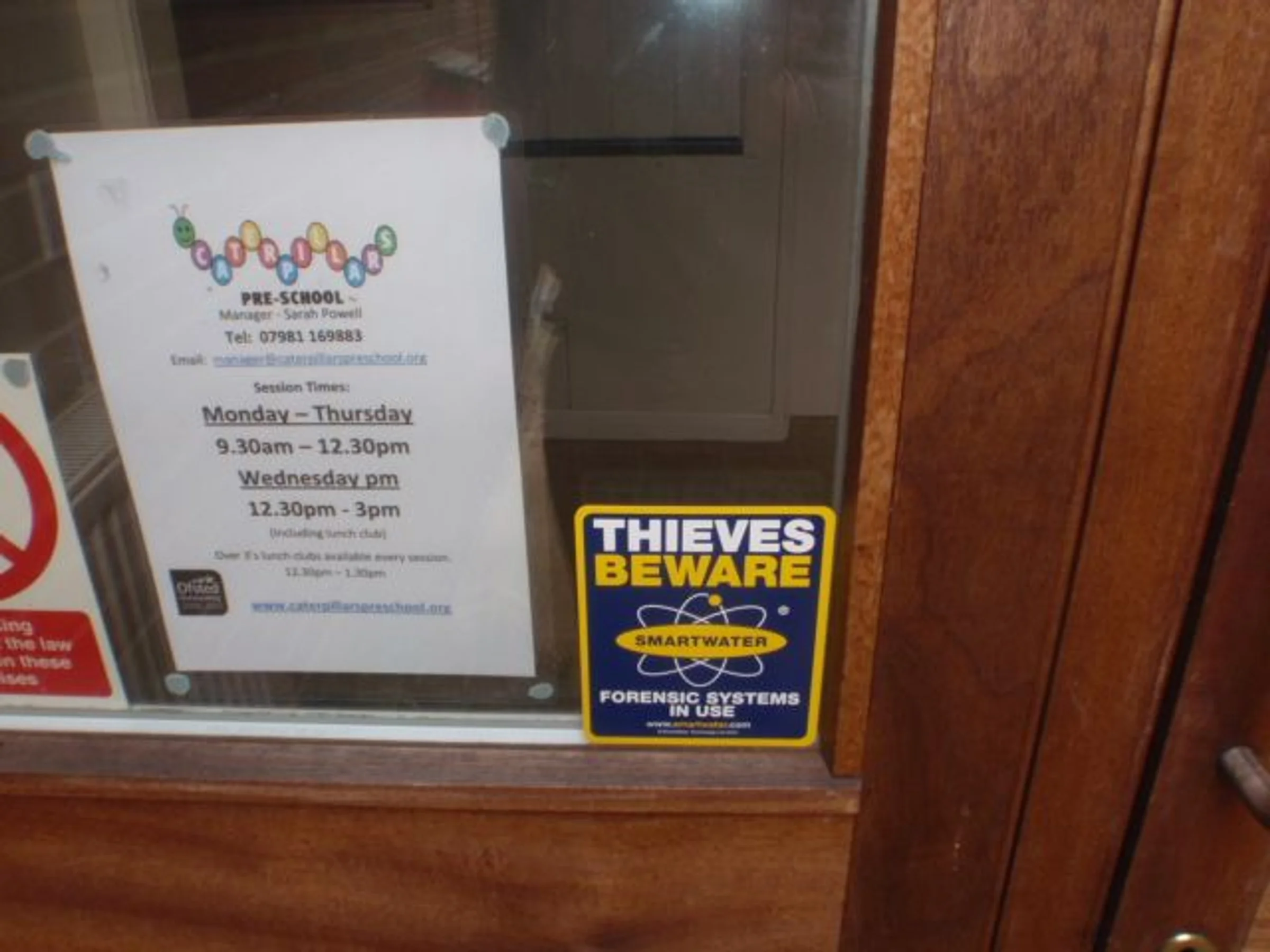 Close up photograph of the "Thieves Beware" smartwater sticker on the door to the Church Hall.