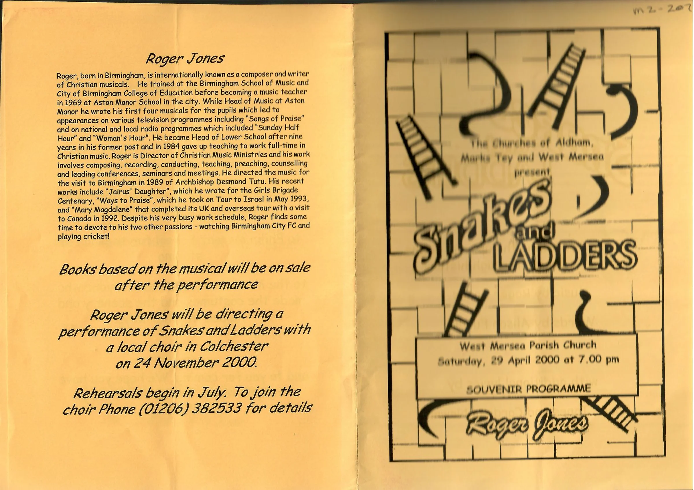 Programme from the Snakes and Ladders musical performed by the Churches of Aldham, Marks Tey and West Mersea, performed in West Mersea Parish Church 29th April 2000. Page 1 of 4.