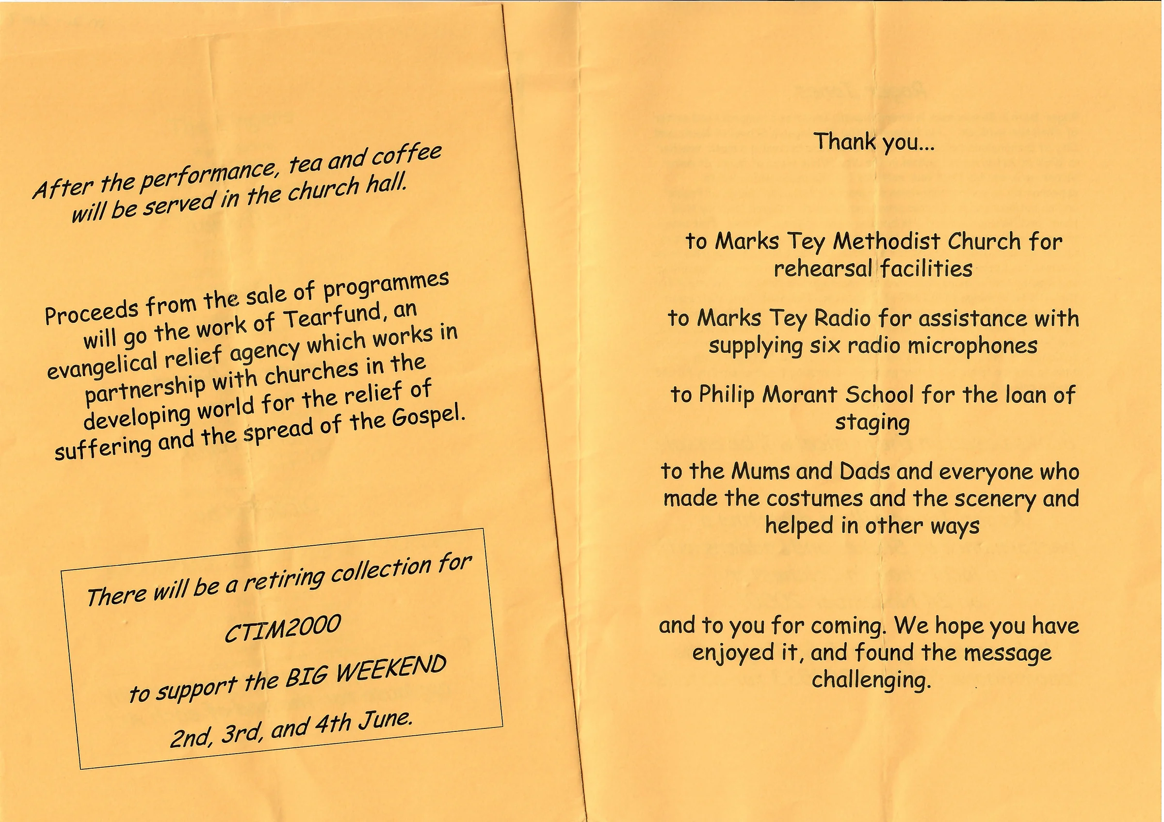 Programme from the Snakes and Ladders musical performed by the Churches of Aldham, Marks Tey and West Mersea, performed in West Mersea Parish Church 29th April 2000. Page 4 of 4.