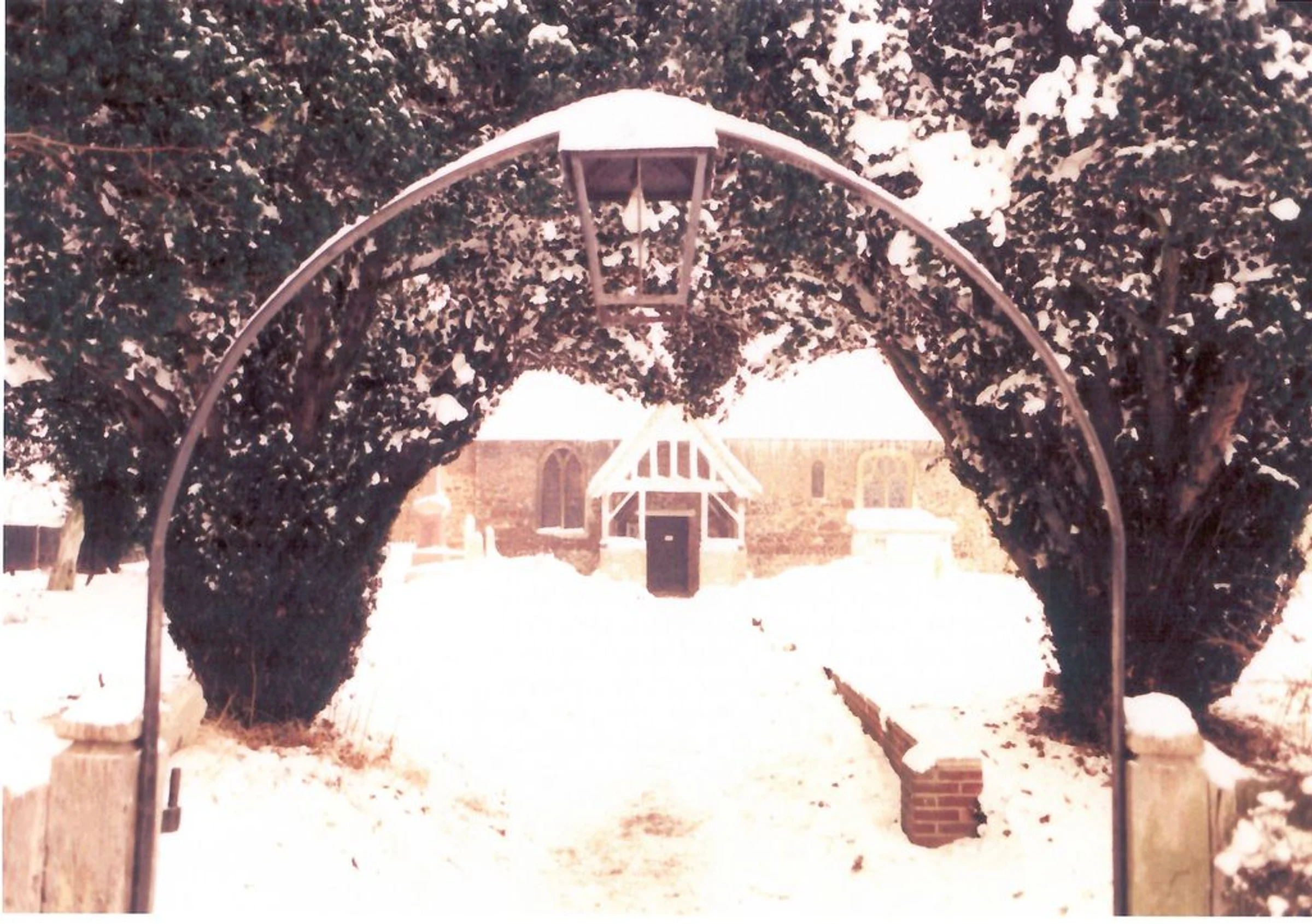 Photograph looking north through the churchyard arch towards the church porch, in the snow. Dated February 1991.