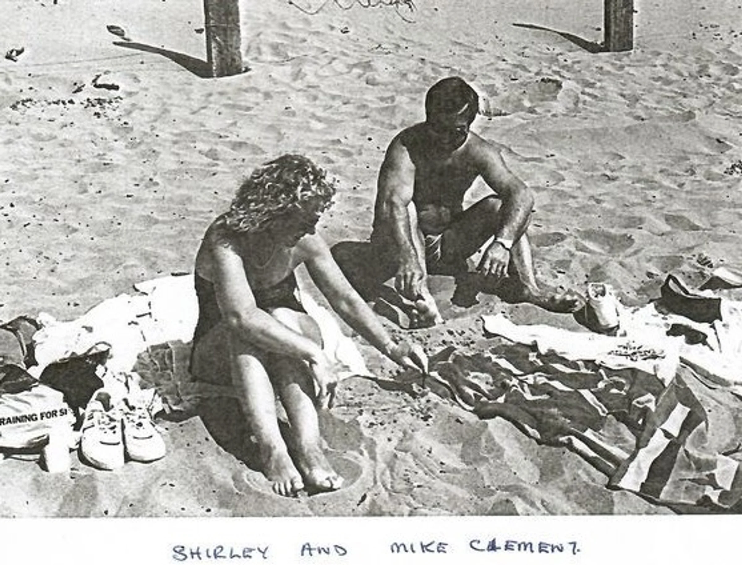 Black and white photograph of Shirley and Mike Clement at the St Andy's camp at Bideford, Devon, August 1990.