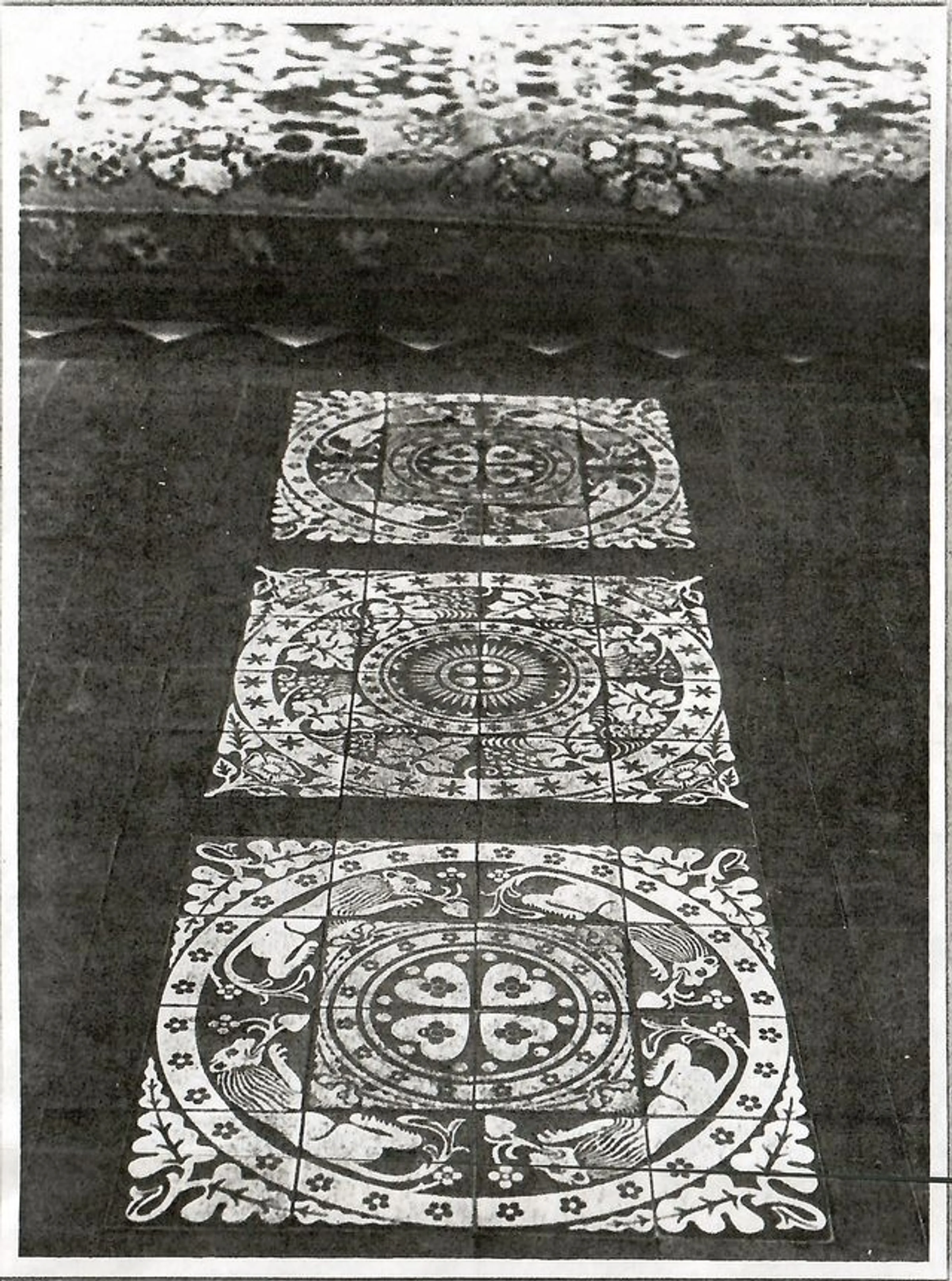 Black and white postcard of floor tiles in St Andrew's Church, held by the National Monuments Record. Unclear which is the correct reverse side, may be dated 1925.