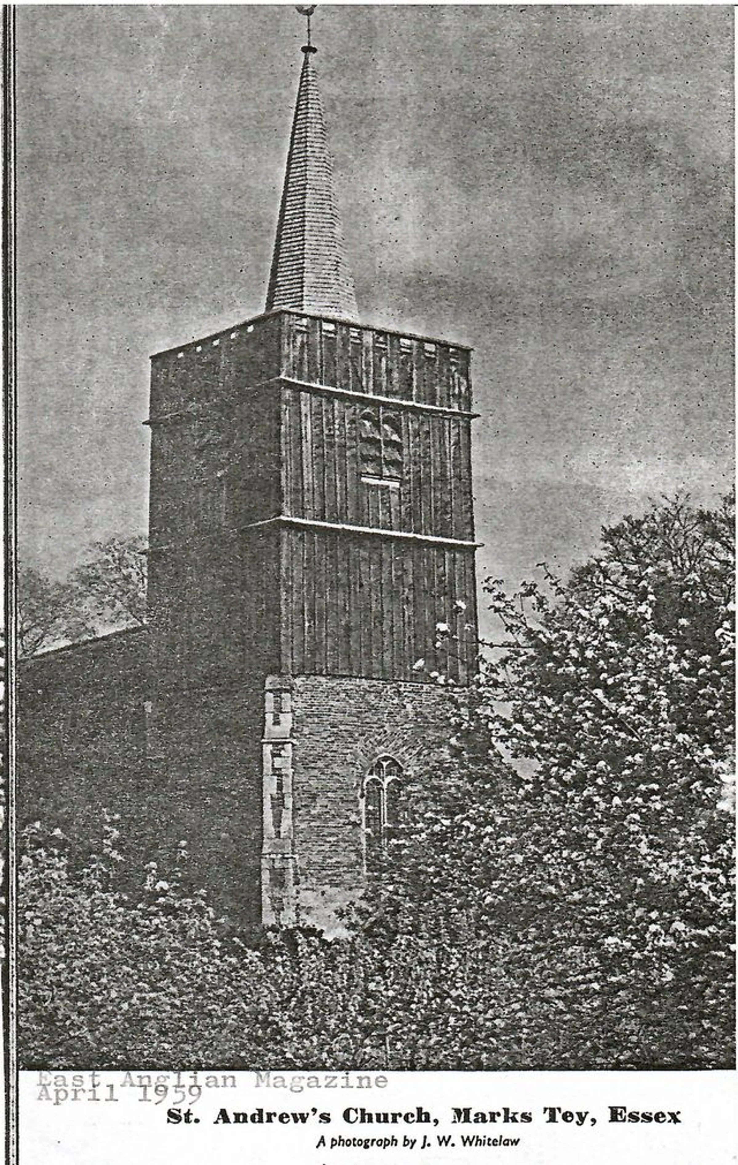 Black and white photograph looking southeast of the church tower by J. W. Whitelaw, published in the East Anglian Magazine, April 1959.