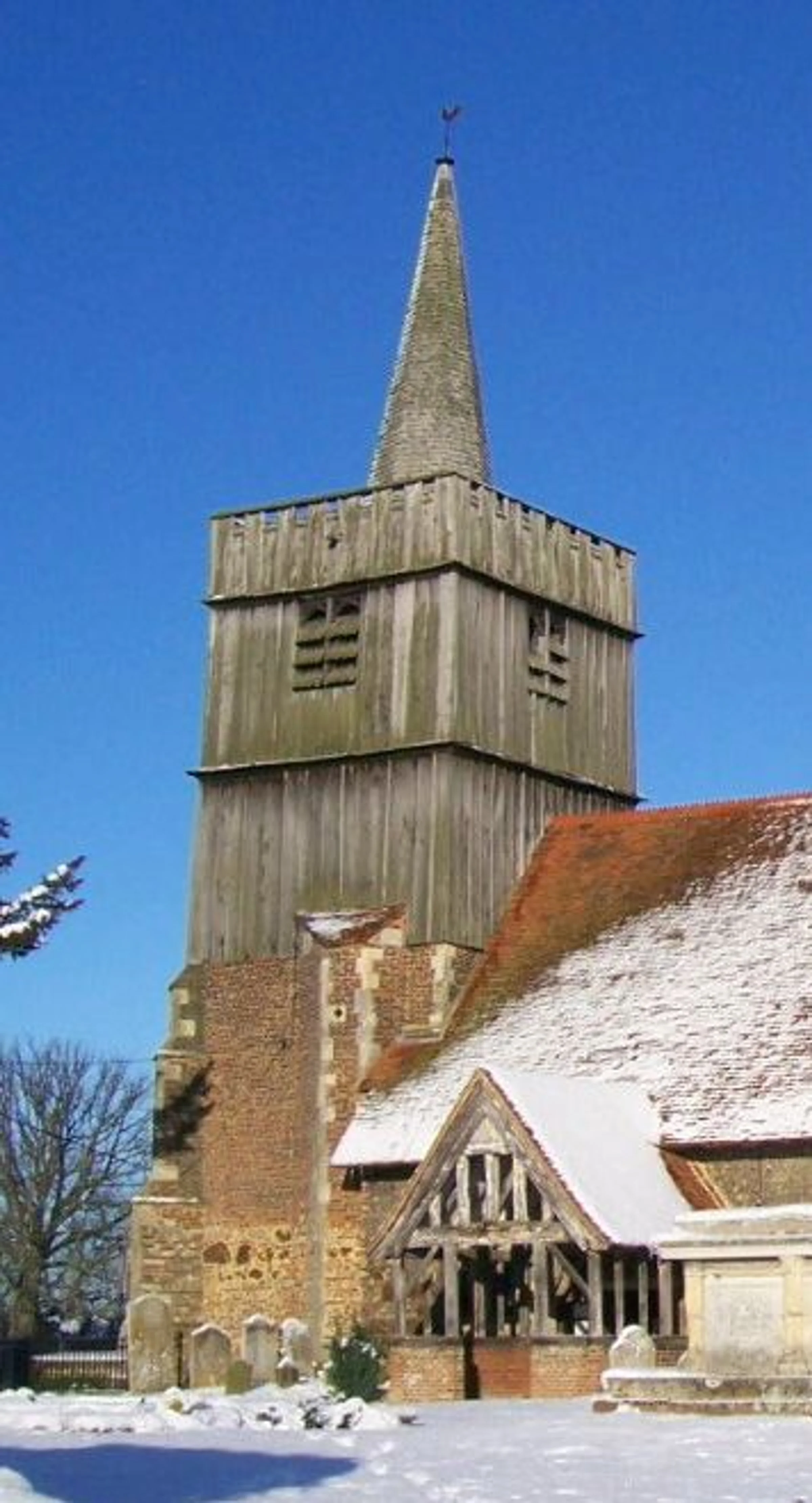 Photograph looking northwest of St Andrew's Church tower in the sunshine and snow, dated 29th October 2009. Image used for the November magazine.