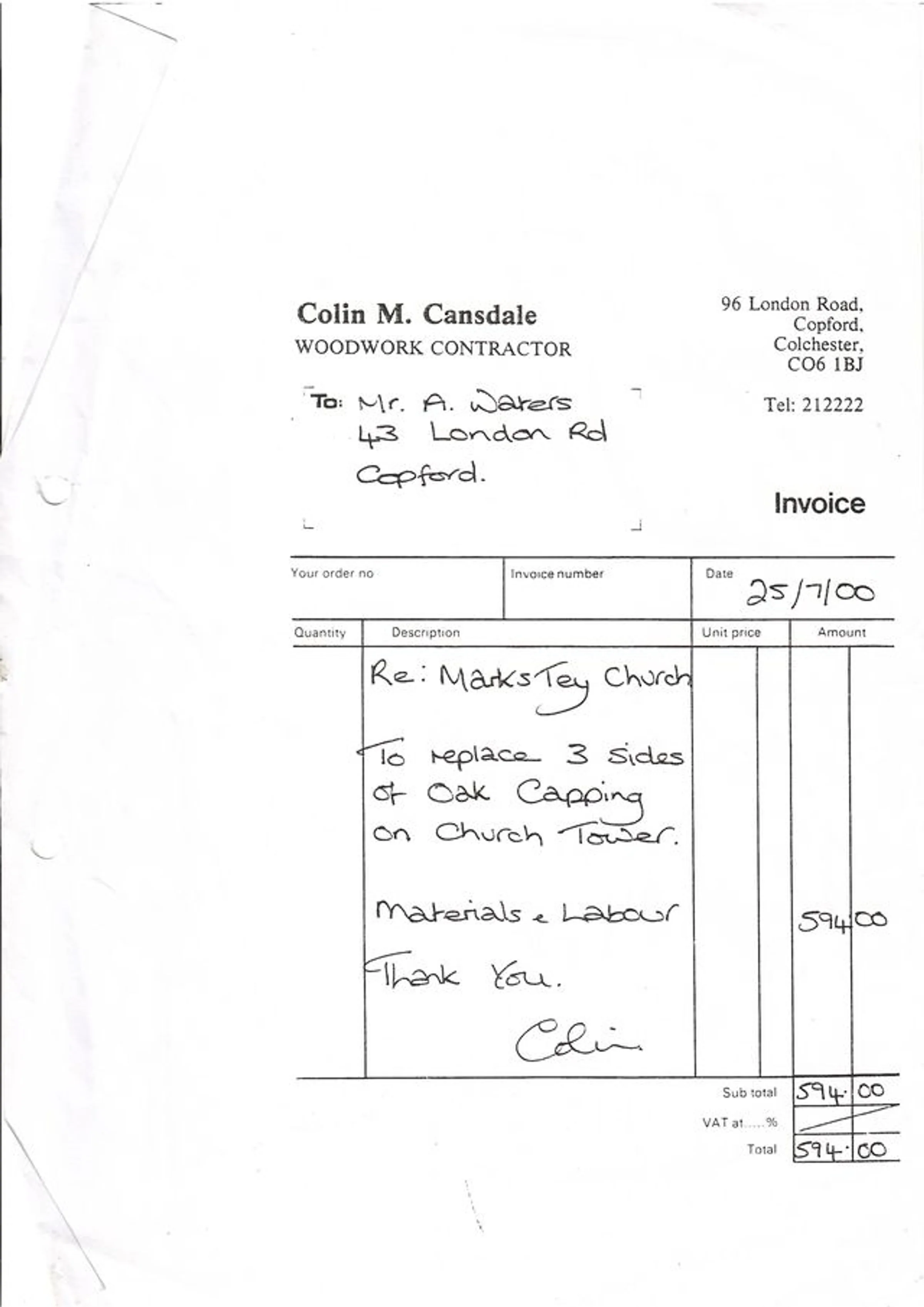 Invoice from Colin M. Cansdale Woodwork Contractor for repairing the tower parapets, dated 25th July 2000.