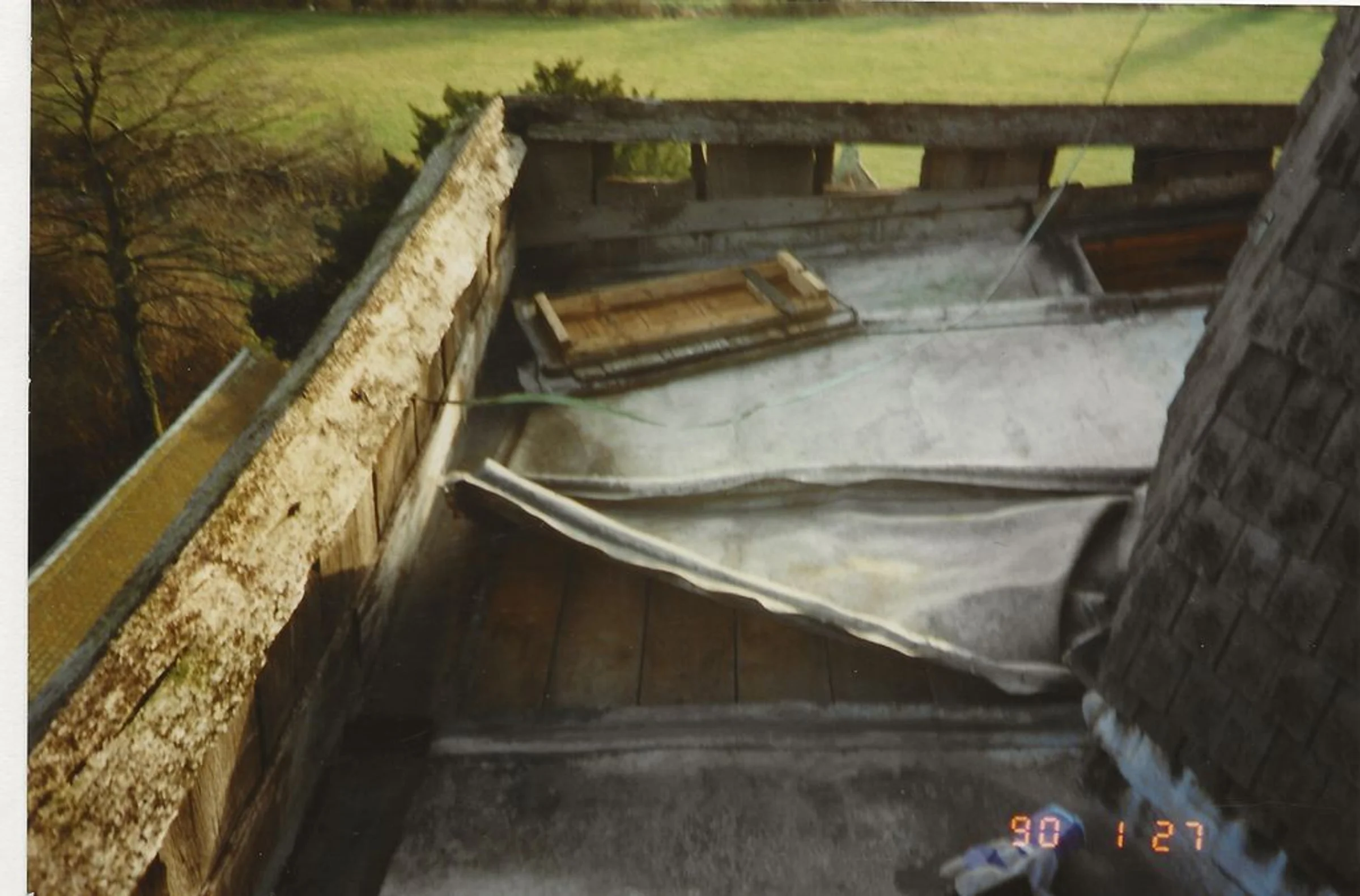Photograph taken at the top of the tower showing damage to the lead tower roof. Unknown date.
