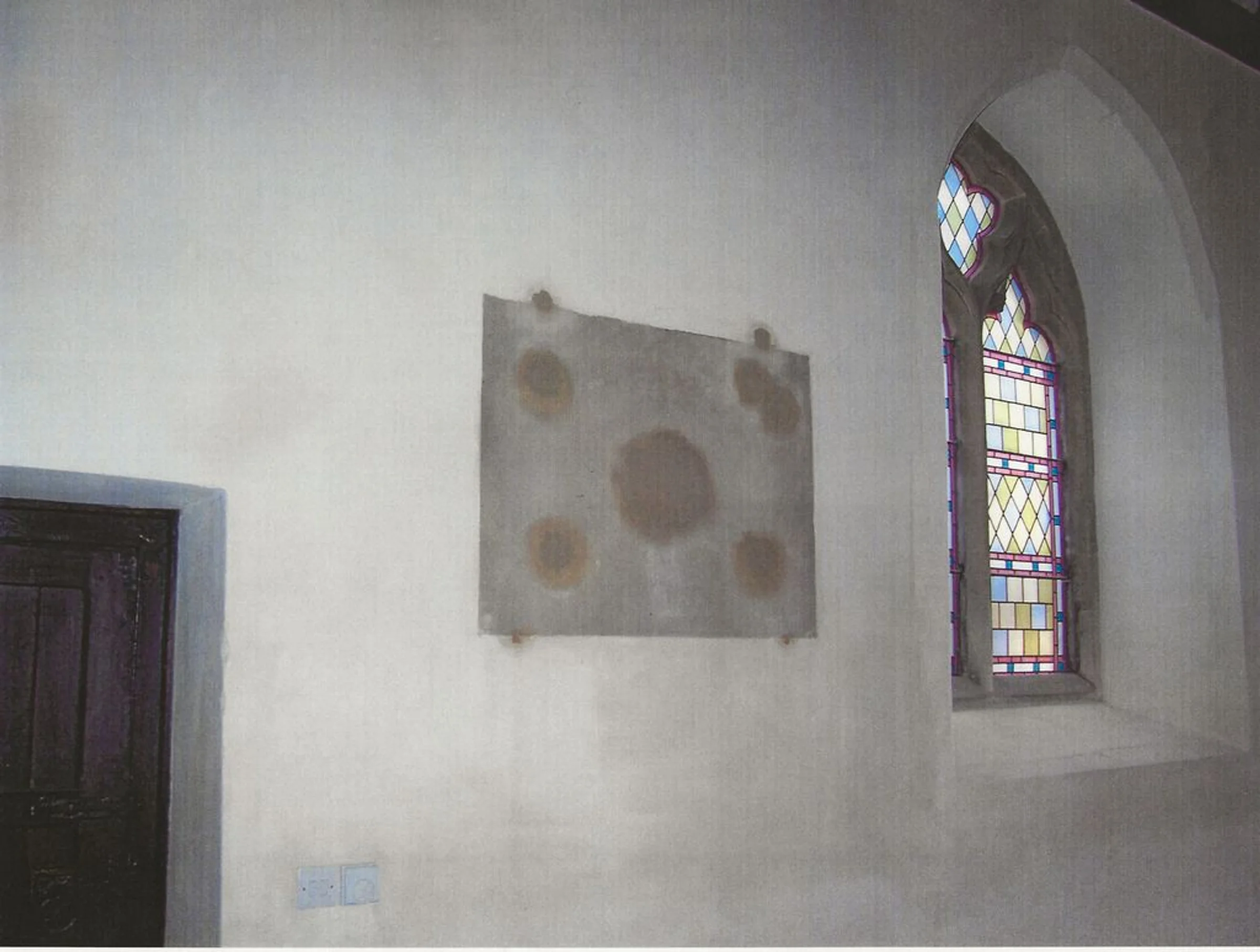 Photograph of the space on the north nave wall where the war memorial plaque is usually located, removed during 2007 reordering.