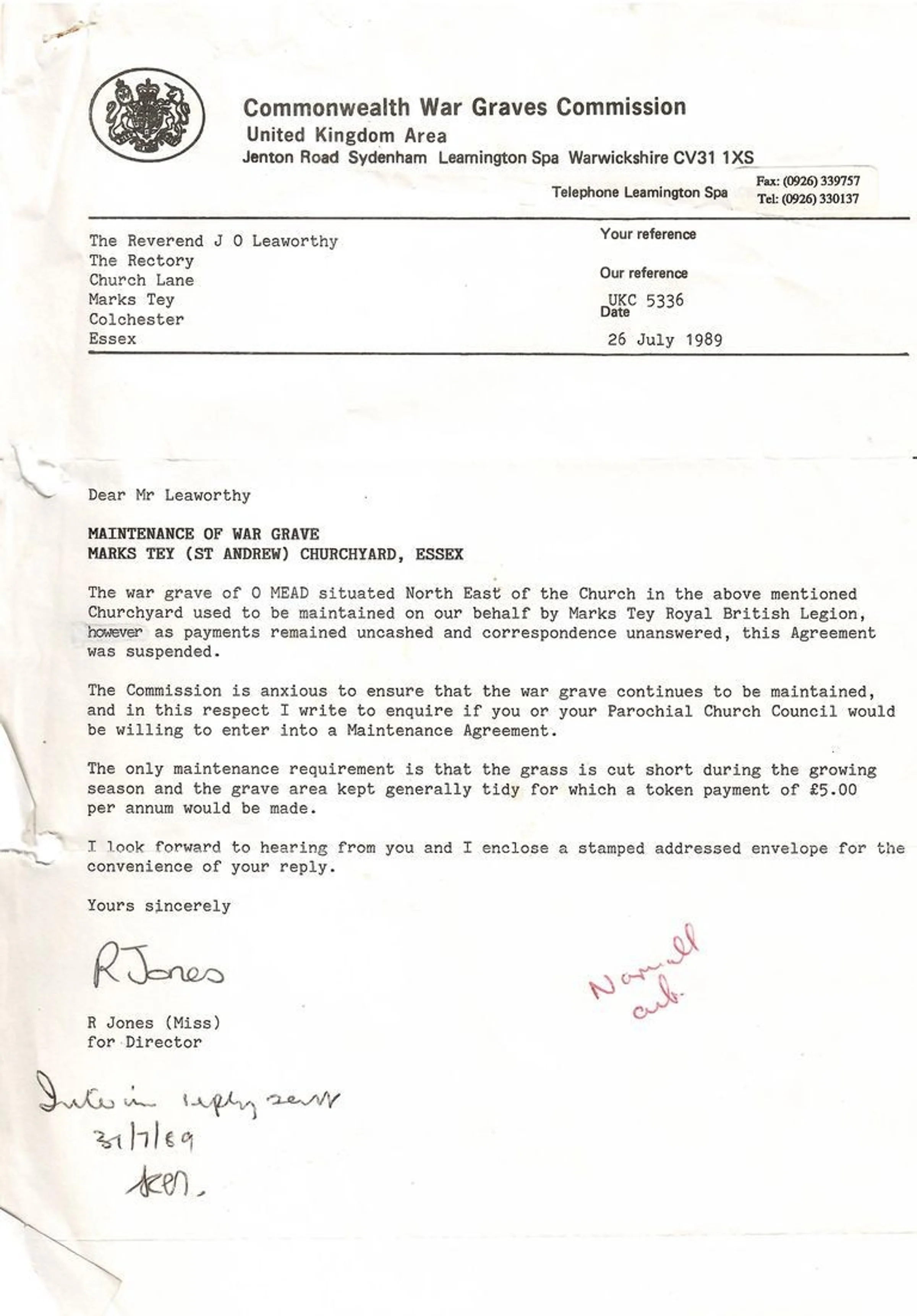 Letter to Rev J Leoworthy from the Commonwealth War Graves Commision regarding the maintenance of the war grave of O Mead, dated 26th July 1989.