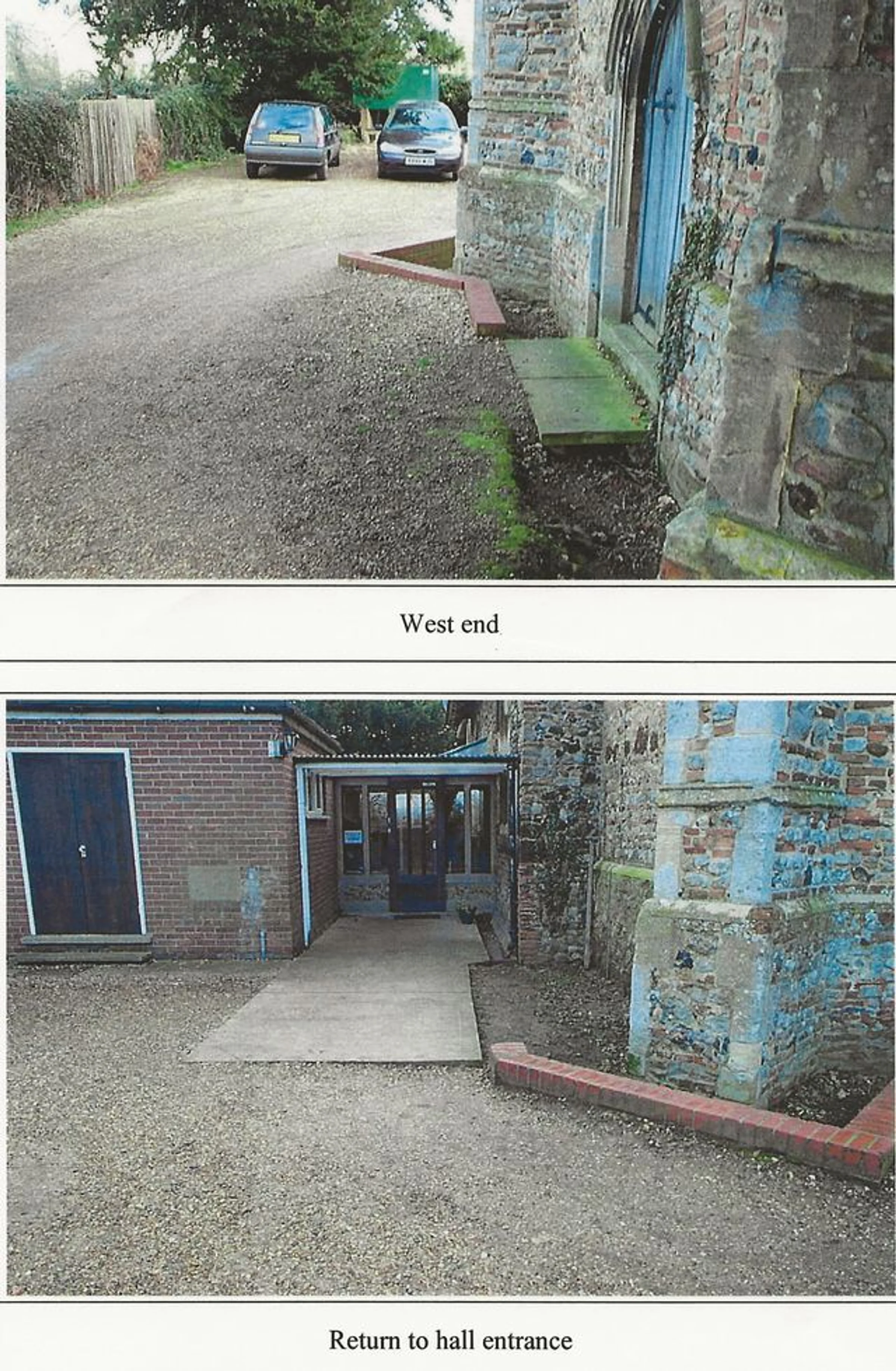 Two photographs of the external west end of the church. The first is taken looking north and shows the west door and Church Hall car park and labelled "West end". The second looks east and includes the church and hall, labelled "Return to hall entrance".