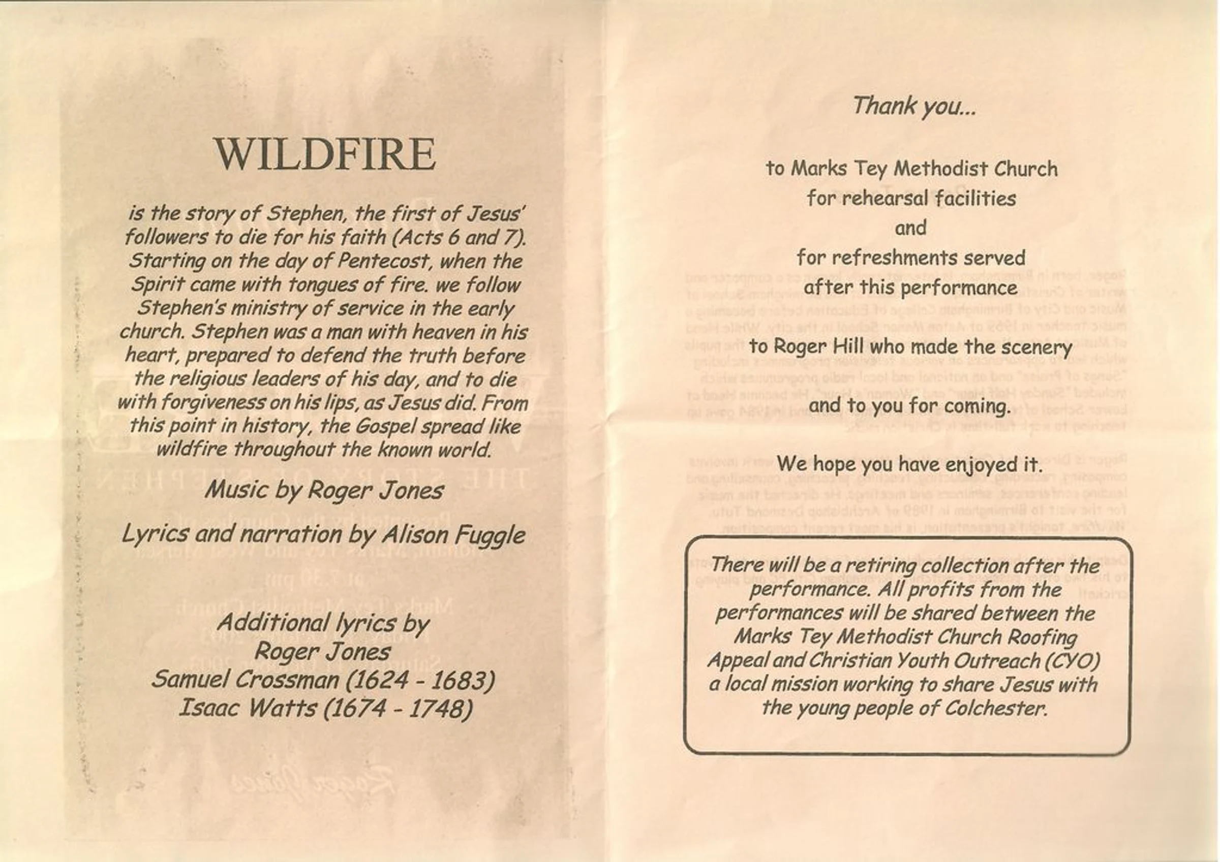 Concert programme from a performance of "Wildfire: The Story of Stephen", by churches of Aldham, Marks Tey and West Mersea, 10th-11th October 2003. Page 2 of 4.