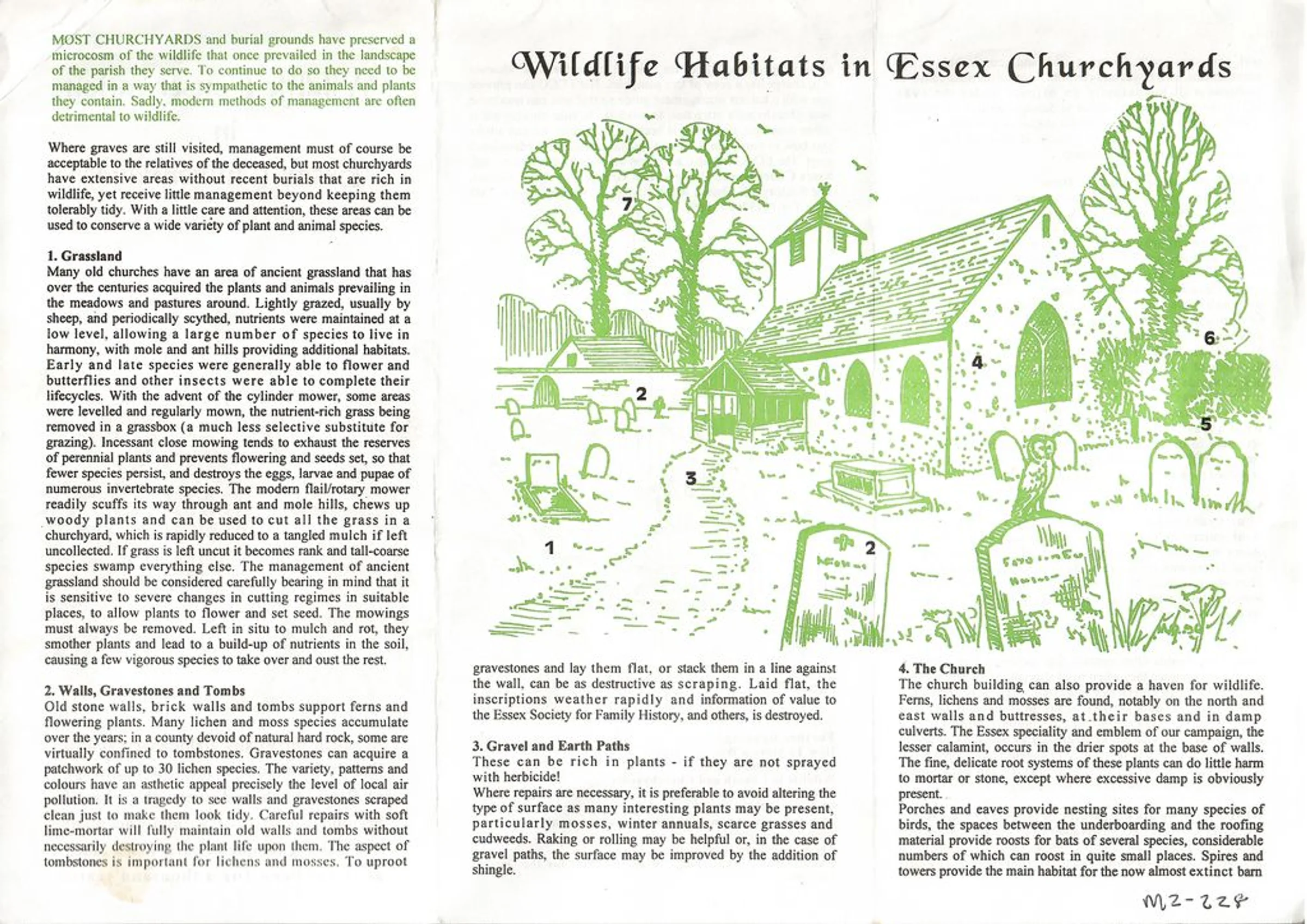 Leaflet about Wildlife Habitats in Essex Churchyards, with illustration of Little Tey church on this side and Marks Tey on the other. Page 1 of 2.