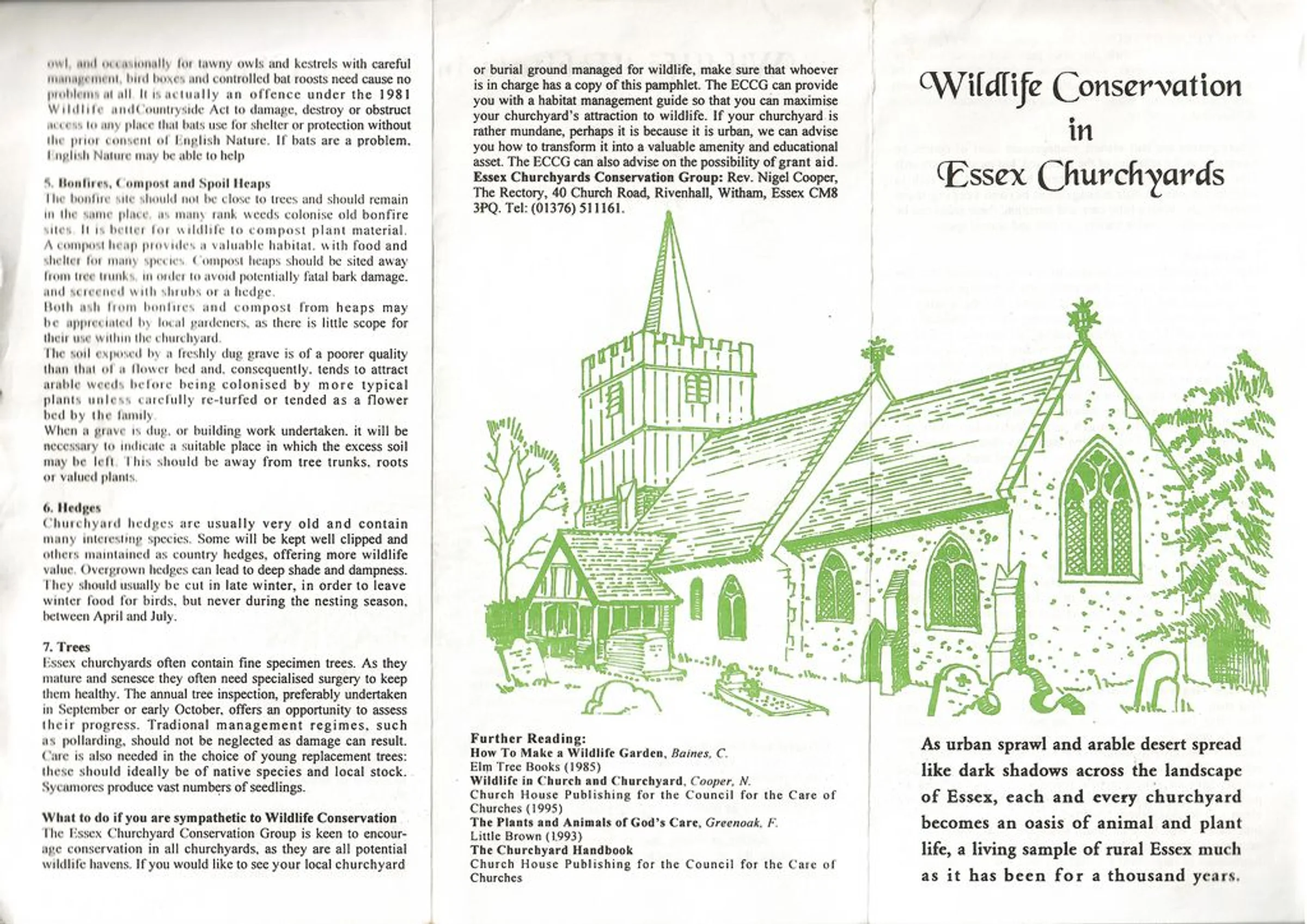 Leaflet about Wildlife Habitats in Essex Churchyards, with illustration of Marks Tey church on this side and Little Tey on the other. Page 2 of 2.