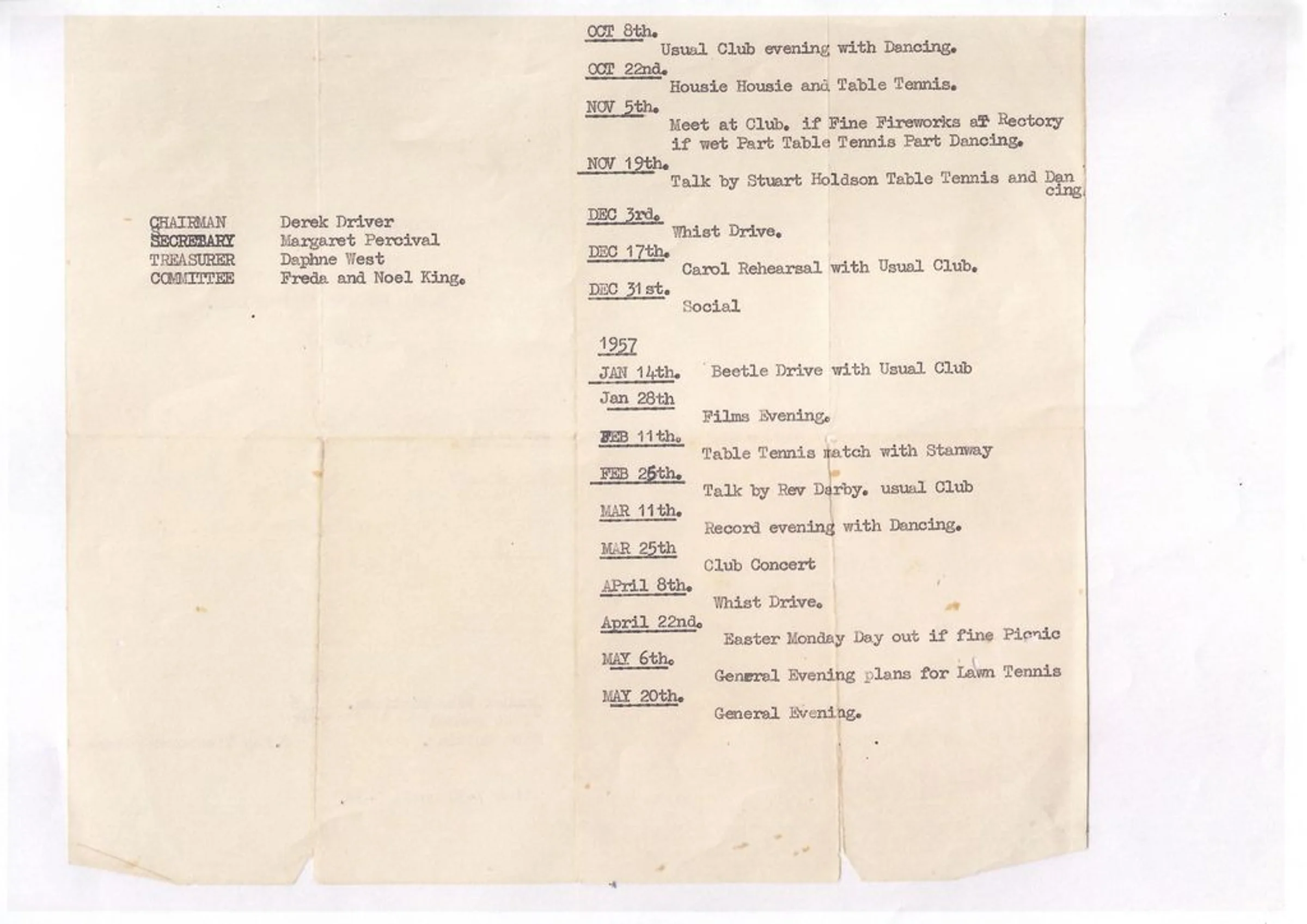 Typed programme for Youth Fellowship Meetings 1956-57, page 2 of 2.